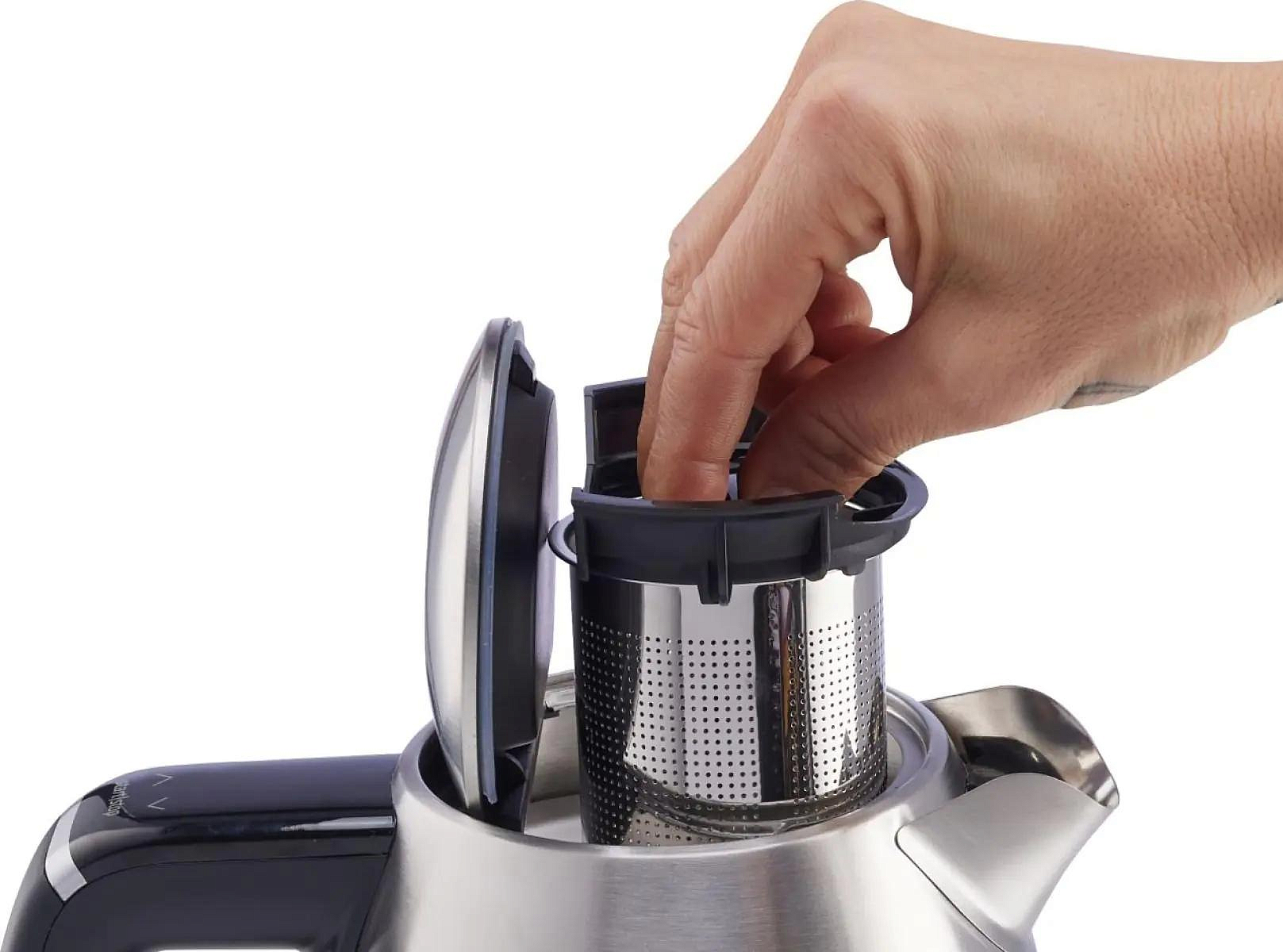 Фильтр для воды, встроенный в носик чайника, можно легко извлечь и очистить, что положительно влияет на простоту ухода за устройством. Мощность прибора составляет 2200 Вт, что позволяет быстро нагреть воду до нужной температуры.