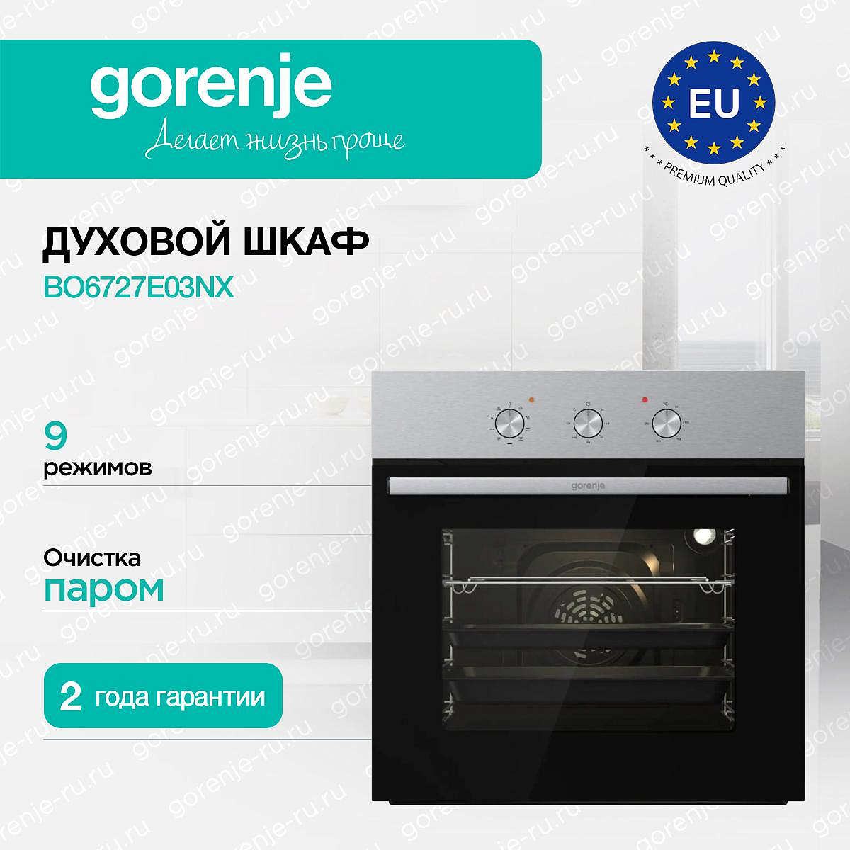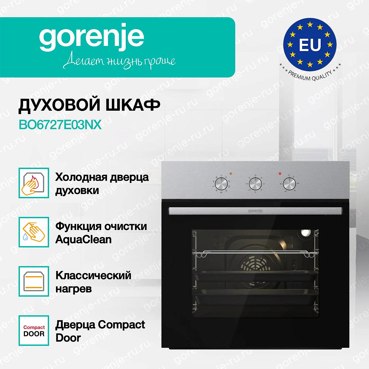 ** Все информационные материалы, представленные на Сайте, носят справочный характер и не могут в полной мере передавать достоверную информацию о свойствах, комплектации и характеристиках товара, включая цвета, размеры и формы. Фирма-производитель оставляет за собой право на внесение изменений в конструкцию, дизайн и комплектацию товара без предварительного уведомления. Перед оформлением Заказа Покупатель должен обратиться к Продавцу для уточнения свойств и характеристик Товара. Подробная информация о товаре указывается в инструкции и на упаковке товара. Используемое название в России: Горенье BO6727E03NX