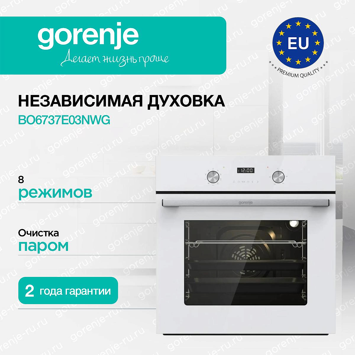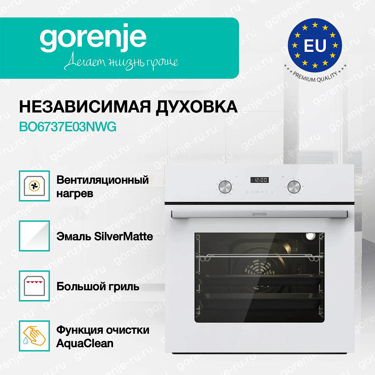 ** Все информационные материалы, представленные на Сайте, носят справочный характер и не могут в полной мере передавать достоверную информацию о свойствах, комплектации и характеристиках товара, включая цвета, размеры и формы. Фирма-производитель оставляет за собой право на внесение изменений в конструкцию, дизайн и комплектацию товара без предварительного уведомления. Перед оформлением Заказа Покупатель должен обратиться к Продавцу для уточнения свойств и характеристик Товара. Подробная информация о товаре указывается в инструкции и на упаковке товара. Используемое название в России: Горенье BO6737E03NWG