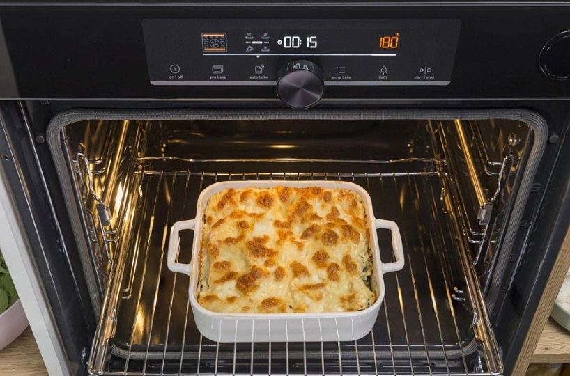 Внутренняя поверхность духовки покрыта пиролитической эмалью SilverMatte, которая отличается гладкостью и отсутствием пор, поэтому жир и частицы пищи не прилипают и легко очищаются. В случае, если загрязнения успели засохнуть, размягчить их поможет паровая очистка Aqua Clean. Потолок внутренней камеры имеет сводчатую форму HomeMade, благодаря которой распределение тепла происходит наиболее эффективным способом, также, как в традиционных дровяных печах. А увеличенная площадь приготовления SuperSize дает возможность готовить даже очень большие блюда.