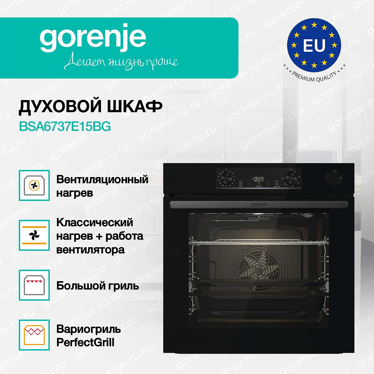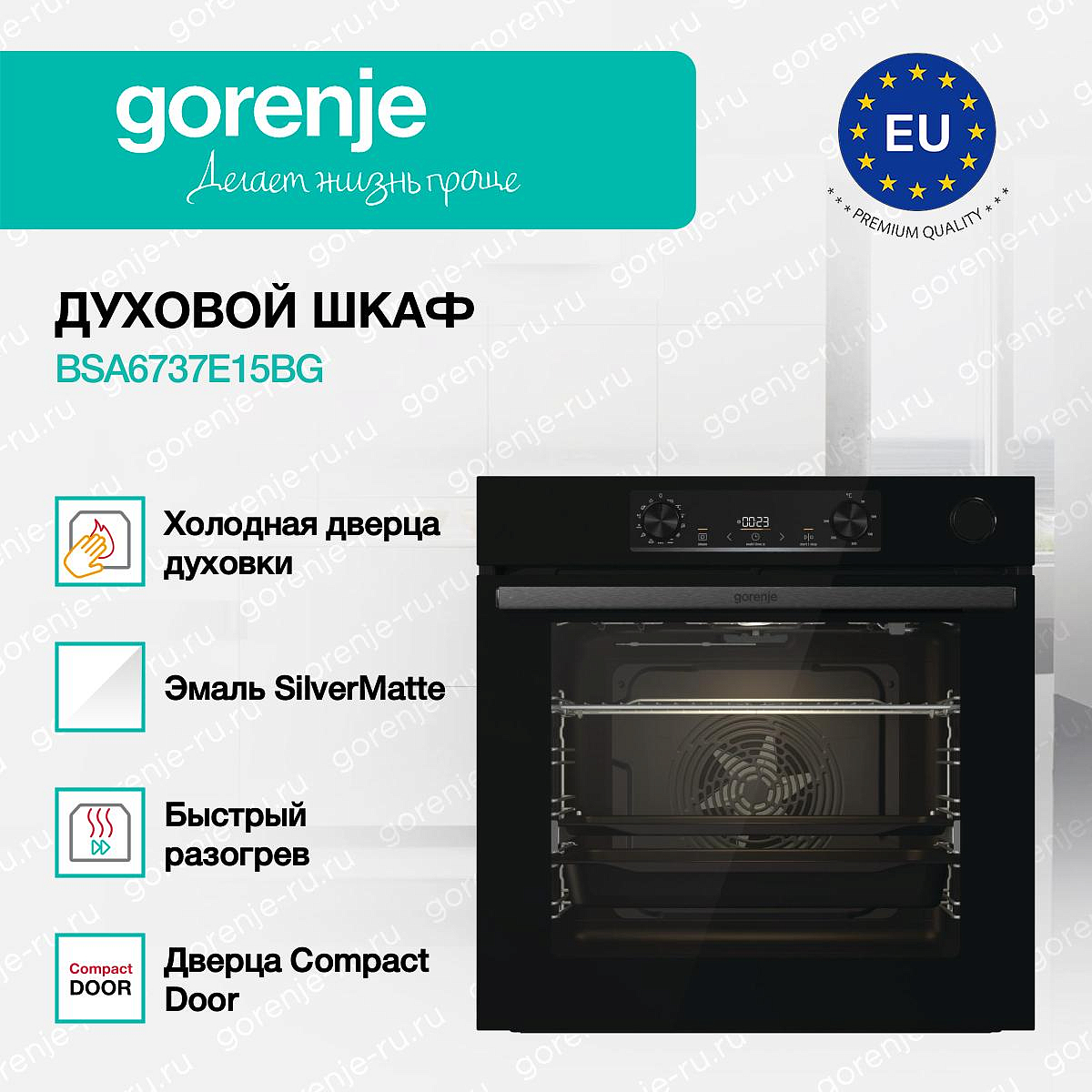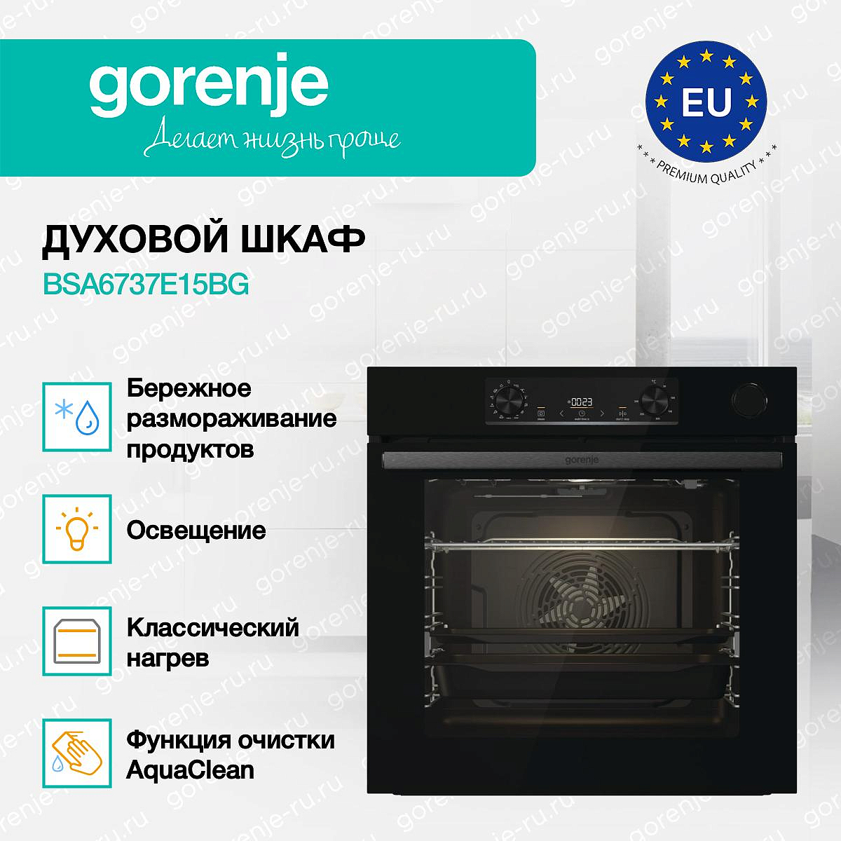 ** Все информационные материалы, представленные на Сайте, носят справочный характер и не могут в полной мере передавать достоверную информацию о свойствах, комплектации и характеристиках товара, включая цвета, размеры и формы. Фирма-производитель оставляет за собой право на внесение изменений в конструкцию, дизайн и комплектацию товара без предварительного уведомления. Перед оформлением Заказа Покупатель должен обратиться к Продавцу для уточнения свойств и характеристик Товара. Подробная информация о товаре указывается в инструкции и на упаковке товара. Используемое название в России: Горенье BSA6737E15BG