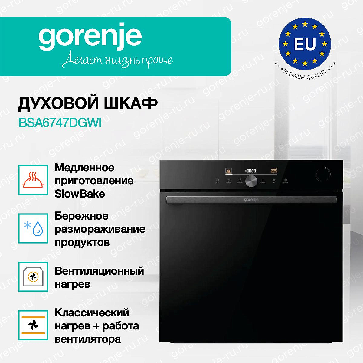 ** Все информационные материалы, представленные на Сайте, носят справочный характер и не могут в полной мере передавать достоверную информацию о свойствах, комплектации и характеристиках товара, включая цвета, размеры и формы. Фирма-производитель оставляет за собой право на внесение изменений в конструкцию, дизайн и комплектацию товара без предварительного уведомления. Перед оформлением Заказа Покупатель должен обратиться к Продавцу для уточнения свойств и характеристик Товара. Подробная информация о товаре указывается в инструкции и на упаковке товара. Используемое название в России: Горенье BSA6747DGWI