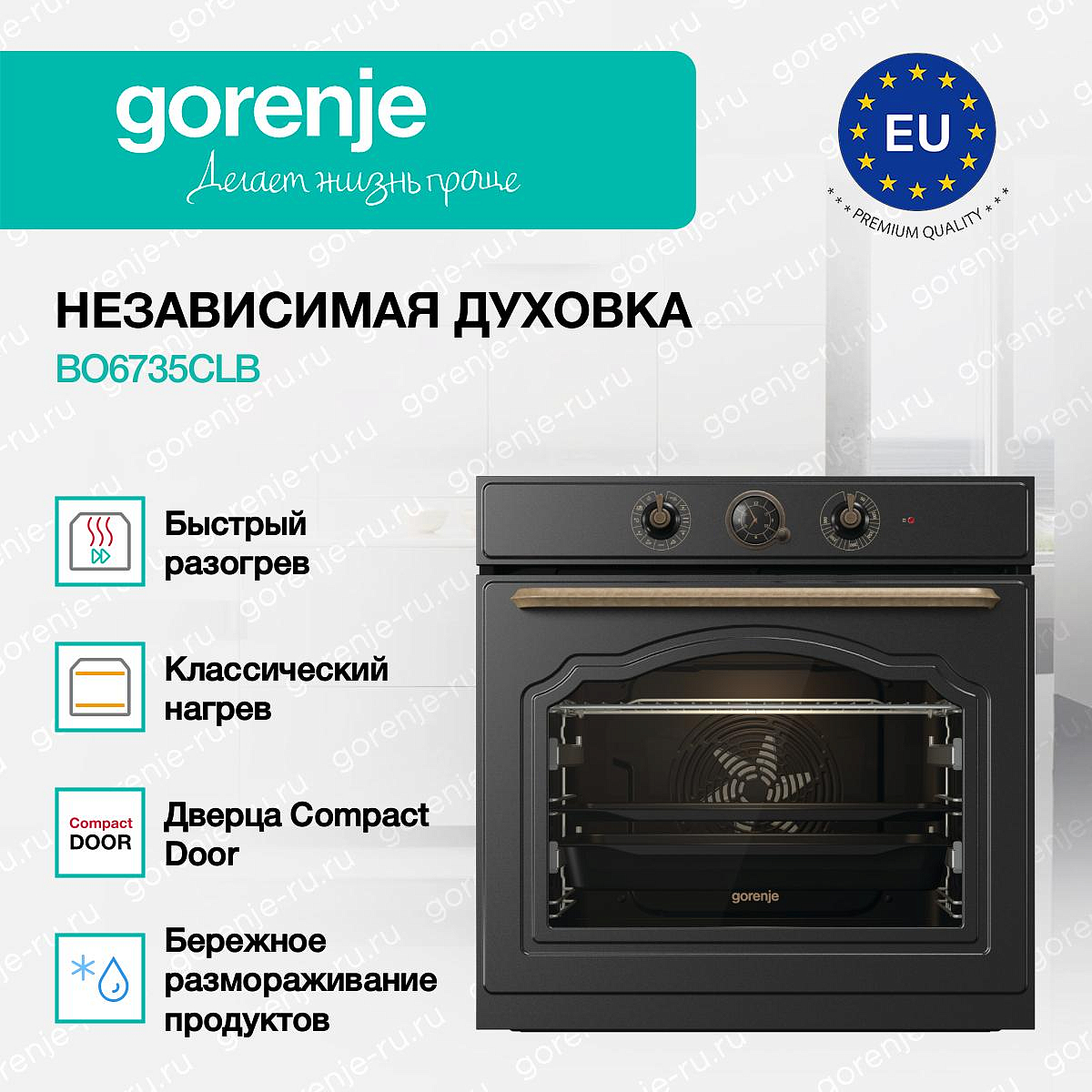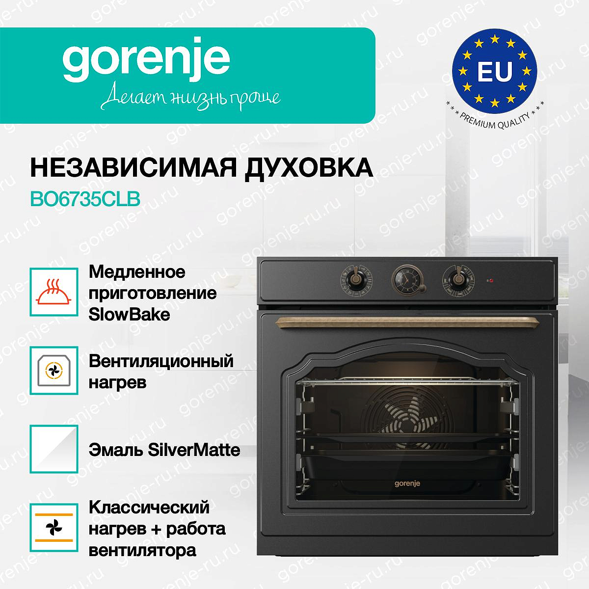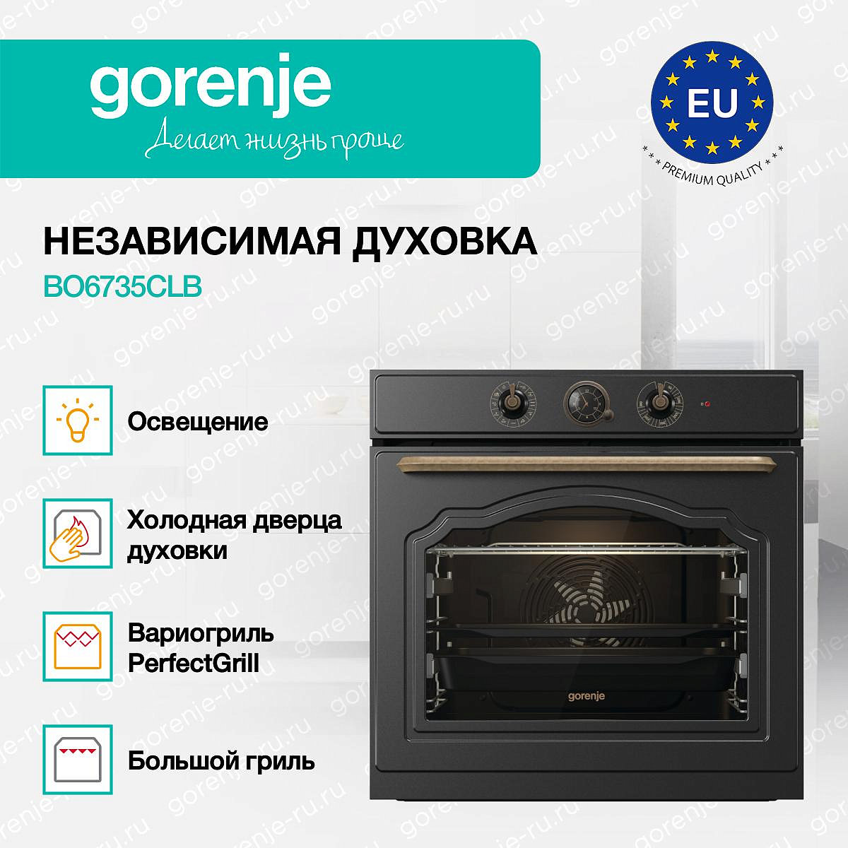 ** Все информационные материалы, представленные на Сайте, носят справочный характер и не могут в полной мере передавать достоверную информацию о свойствах, комплектации и характеристиках товара, включая цвета, размеры и формы. Фирма-производитель оставляет за собой право на внесение изменений в конструкцию, дизайн и комплектацию товара без предварительного уведомления. Перед оформлением Заказа Покупатель должен обратиться к Продавцу для уточнения свойств и характеристик Товара. Подробная информация о товаре указывается в инструкции и на упаковке товара. Используемое название в России: Горенье BO6735CLB
