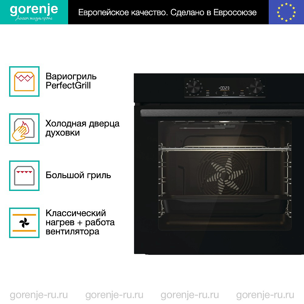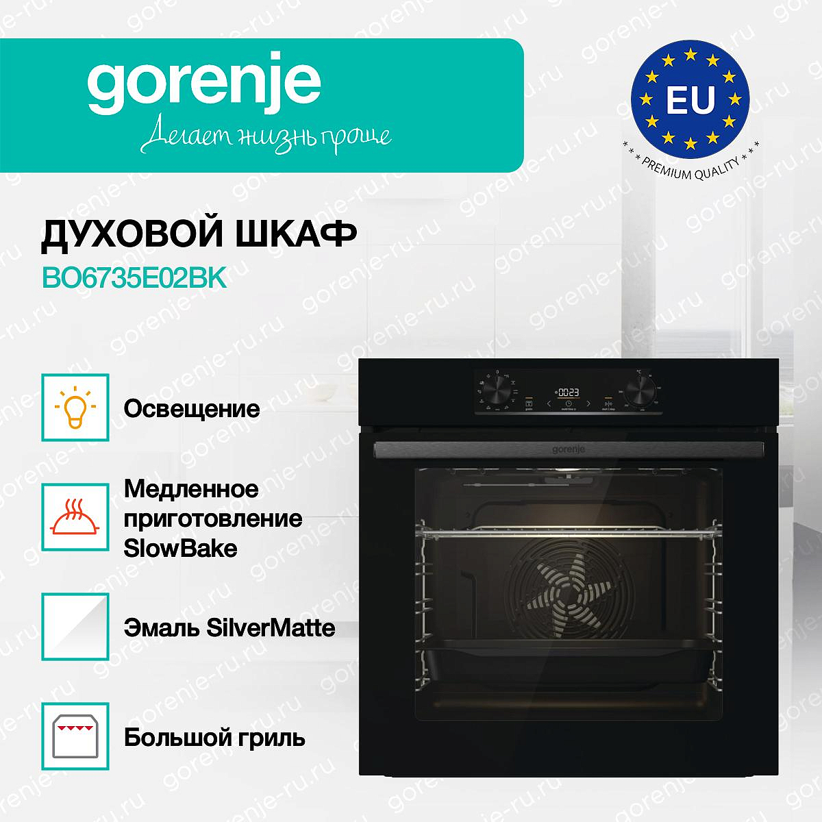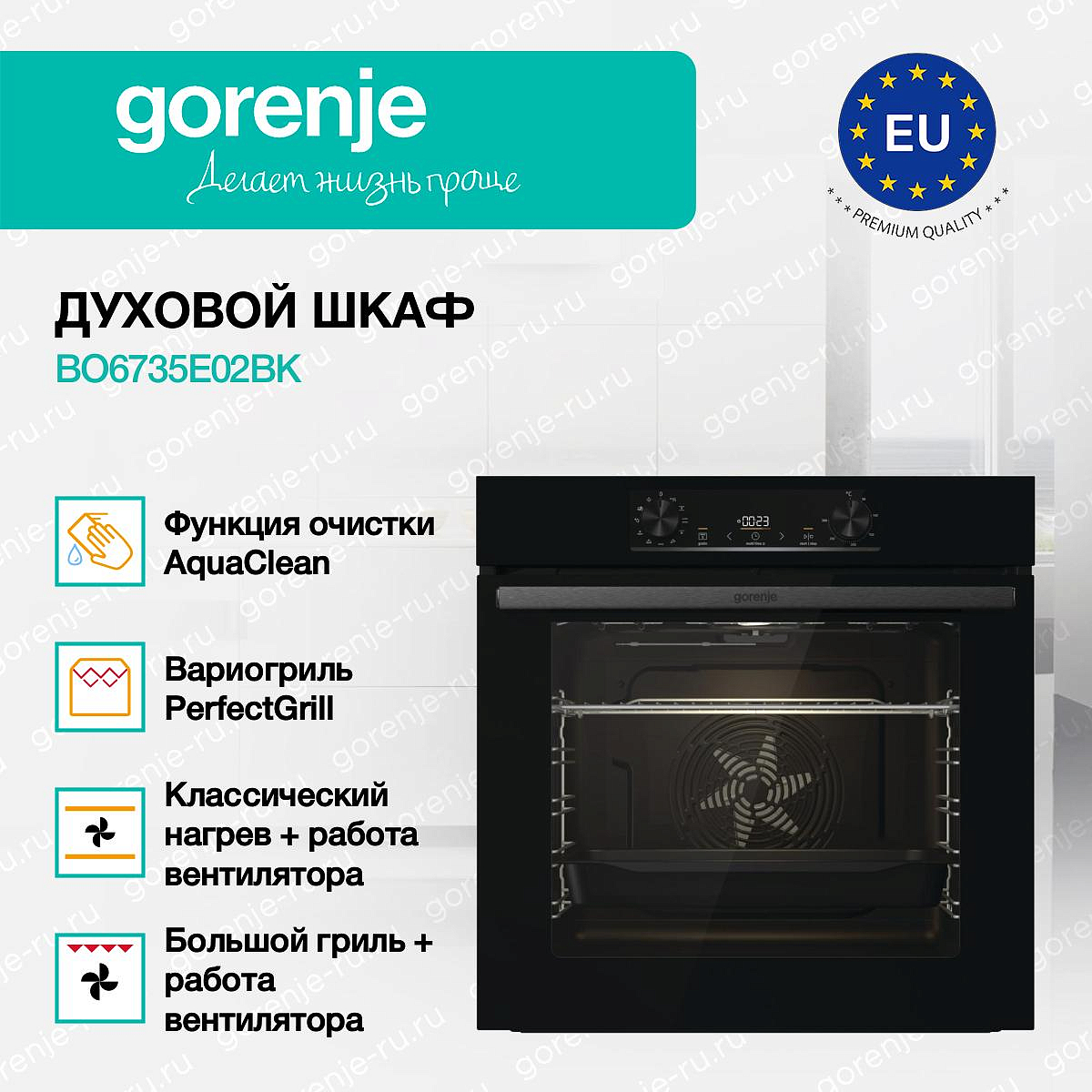 ** Все информационные материалы, представленные на Сайте, носят справочный характер и не могут в полной мере передавать достоверную информацию о свойствах, комплектации и характеристиках товара, включая цвета, размеры и формы. Фирма-производитель оставляет за собой право на внесение изменений в конструкцию, дизайн и комплектацию товара без предварительного уведомления. Перед оформлением Заказа Покупатель должен обратиться к Продавцу для уточнения свойств и характеристик Товара. Подробная информация о товаре указывается в инструкции и на упаковке товара. Используемое название в России: Горенье BO6735E02BK