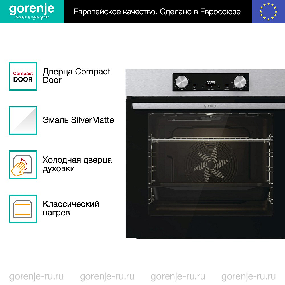 Дверца Compact Door — дверца духового шкафа Gorenje, остекленная по особой технологии. Изнутри она покрыта специальным составом. Наружный слой выполнен из обычного стекла, внутренний изготовлен из закаленного с уникальным отражающим покрытием. Между ними располагается термоизолятор. Благодаря технологии Compact Door дверца остается холодной на ощупь, даже когда духовка разогревается до 400 градусов.