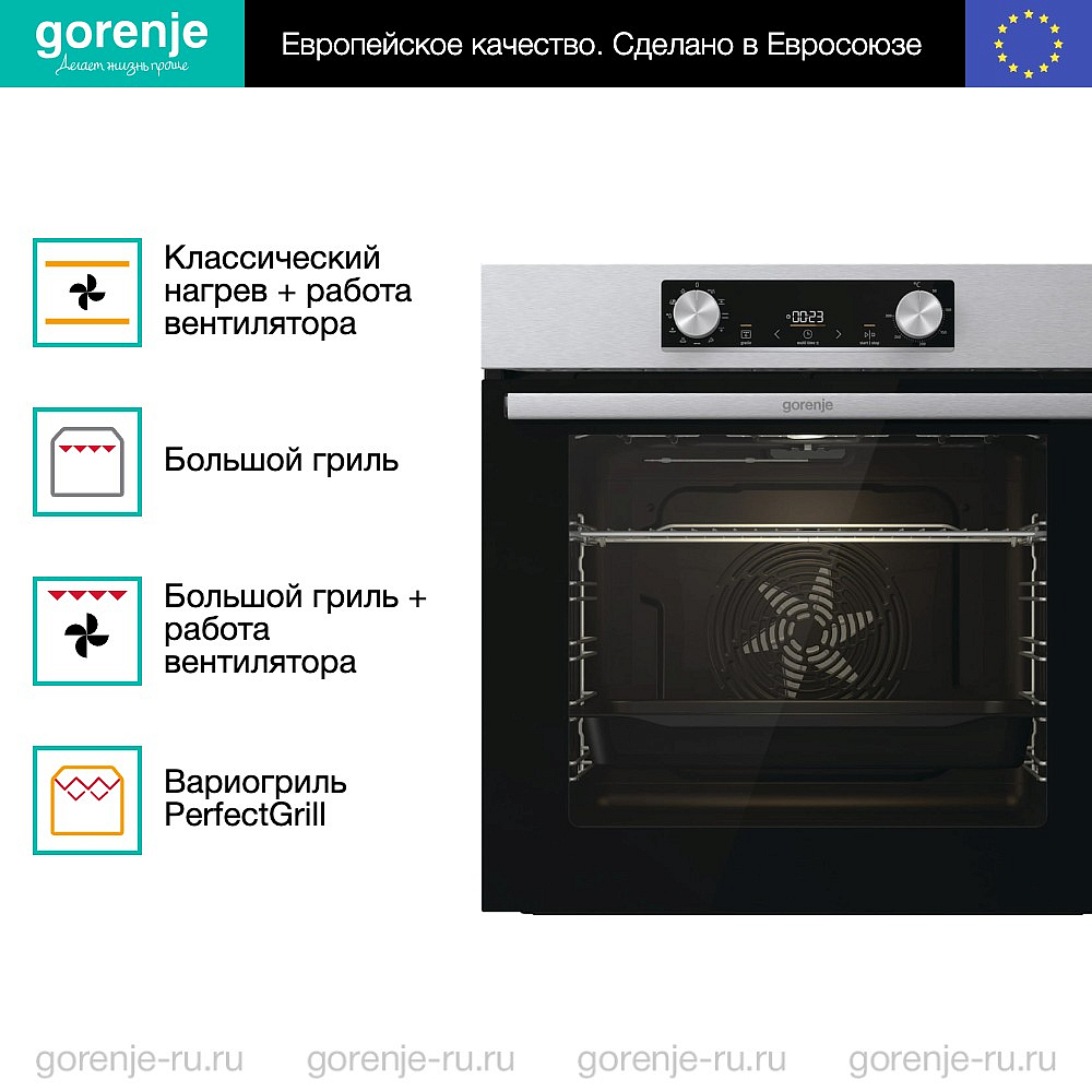 ** Все информационные материалы, представленные на Сайте, носят справочный характер и не могут в полной мере передавать достоверную информацию о свойствах, комплектации и характеристиках товара, включая цвета, размеры и формы. Фирма-производитель оставляет за собой право на внесение изменений в конструкцию, дизайн и комплектацию товара без предварительного уведомления. Перед оформлением Заказа Покупатель должен обратиться к Продавцу для уточнения свойств и характеристик Товара. Подробная информация о товаре указывается в инструкции и на упаковке товара. Используемое название в России: Горенье BO6735E02XK
