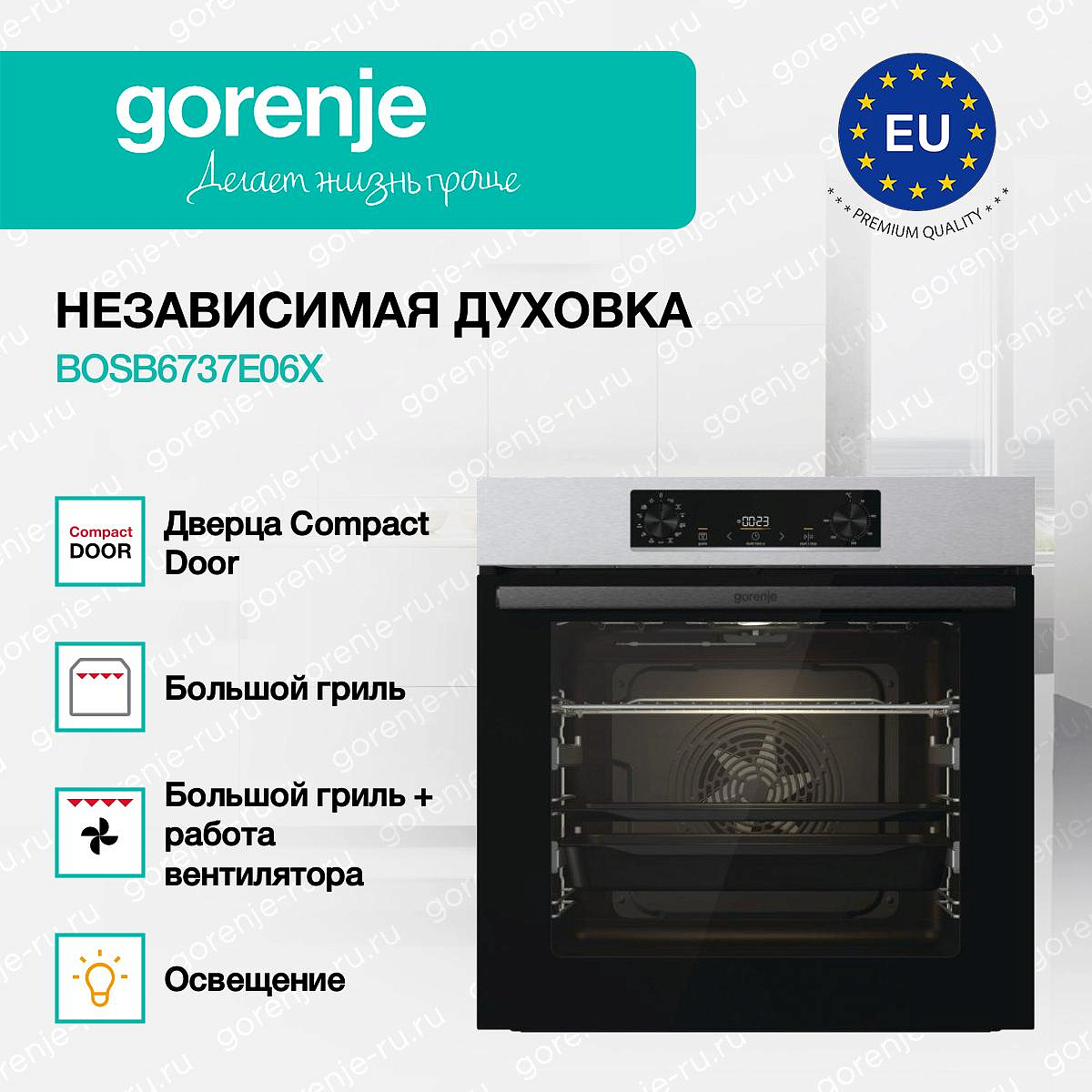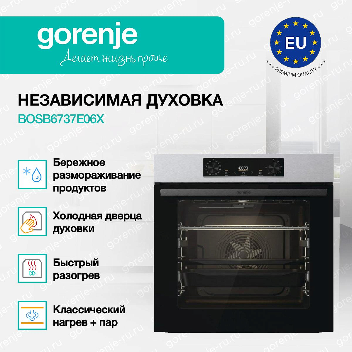 ** Все информационные материалы, представленные на Сайте, носят справочный характер и не могут в полной мере передавать достоверную информацию о свойствах, комплектации и характеристиках товара, включая цвета, размеры и формы. Фирма-производитель оставляет за собой право на внесение изменений в конструкцию, дизайн и комплектацию товара без предварительного уведомления. Перед оформлением Заказа Покупатель должен обратиться к Продавцу для уточнения свойств и характеристик Товара. Подробная информация о товаре указывается в инструкции и на упаковке товара. Используемое название в России: Горенье BOSB6737E06X