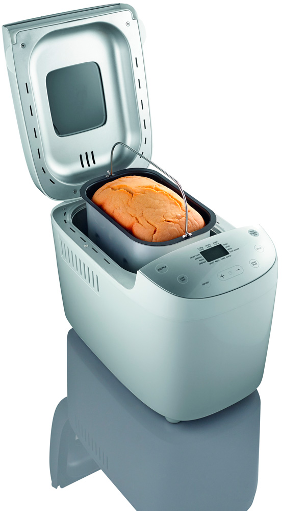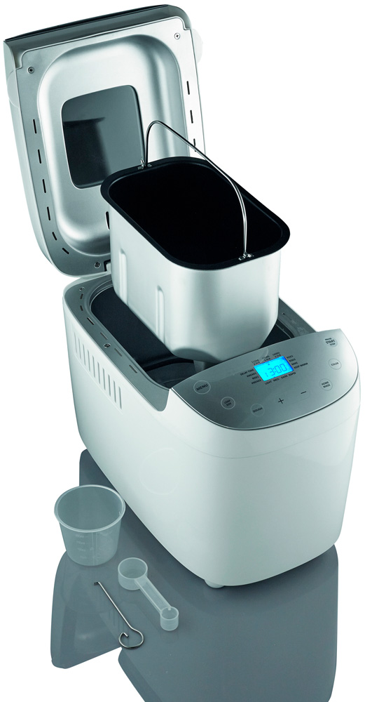 Модель также обеспечивает безопасность использования. Она имеет функцию защиты от перегрева, автоматически отключается, если температура превышена. Звуковой сигнал окончания работы не позволит забыть о том, что блюдо готово. Съемный контейнер для дрожжей облегчает процесс очистки и обслуживания хлебопечи. Благодаря прозрачной крышке с окошком вы сможете наблюдать за приготовления своей выпечки. Размеры составляют 30.7×41×26.8 см, а ее вес — 7,2 кг. В комплекте есть форма, мерный стакан и ложка, книга рецептов, а также 2 тестомешателя.