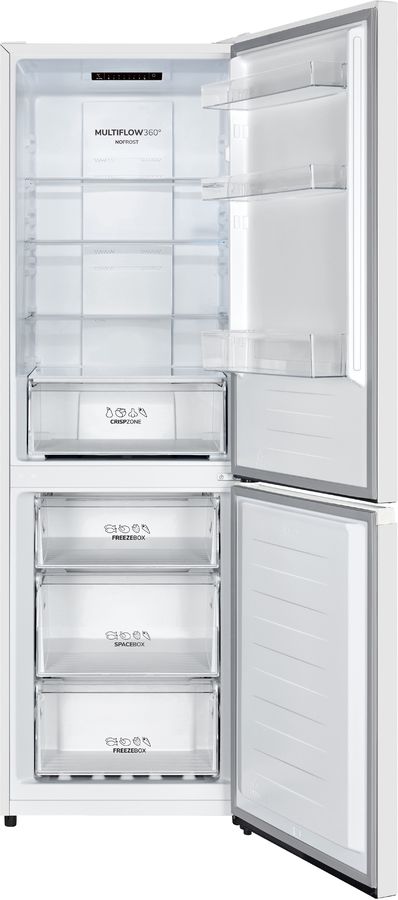 Потолочное освещение равномерно освещает все внутреннее пространство холодильника, создавая оптимальные условия для поиска продуктов. Свет падает сверху, освещая каждый уголок холодильника и минимизируя затемненные участки на полках. Потолочное освещение делает использование устройства более комфортным и упрощает доступ к продуктам, расположенным в глубине. Это особенно полезно при работе с более объемными полками, так как свет проникает вниз, улучшая видимость всех отсеков и полок.