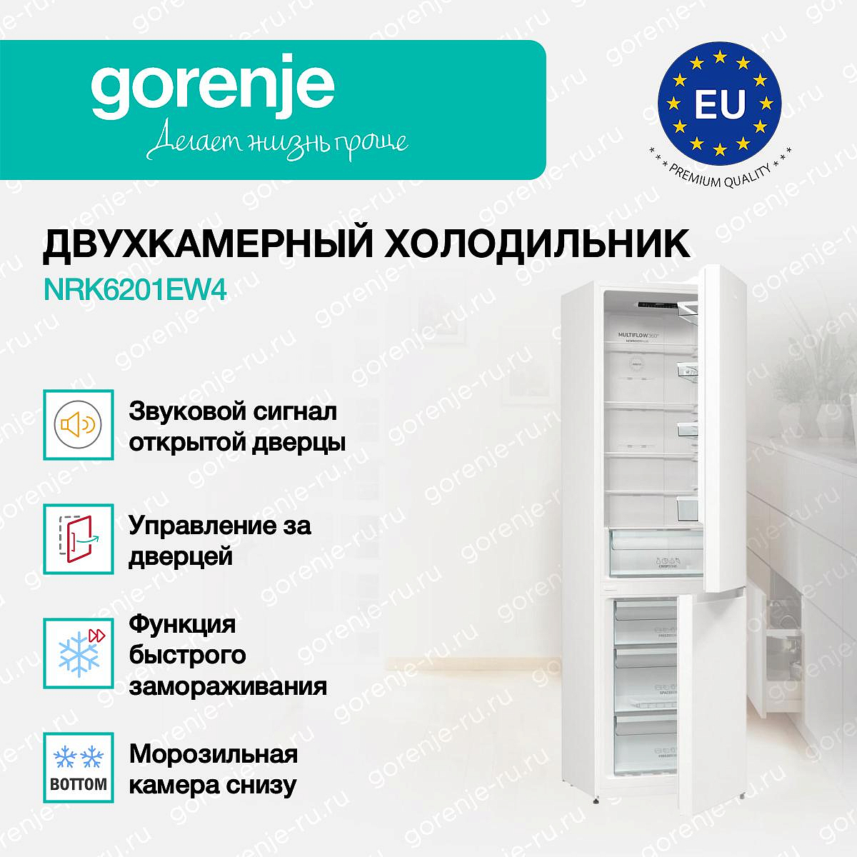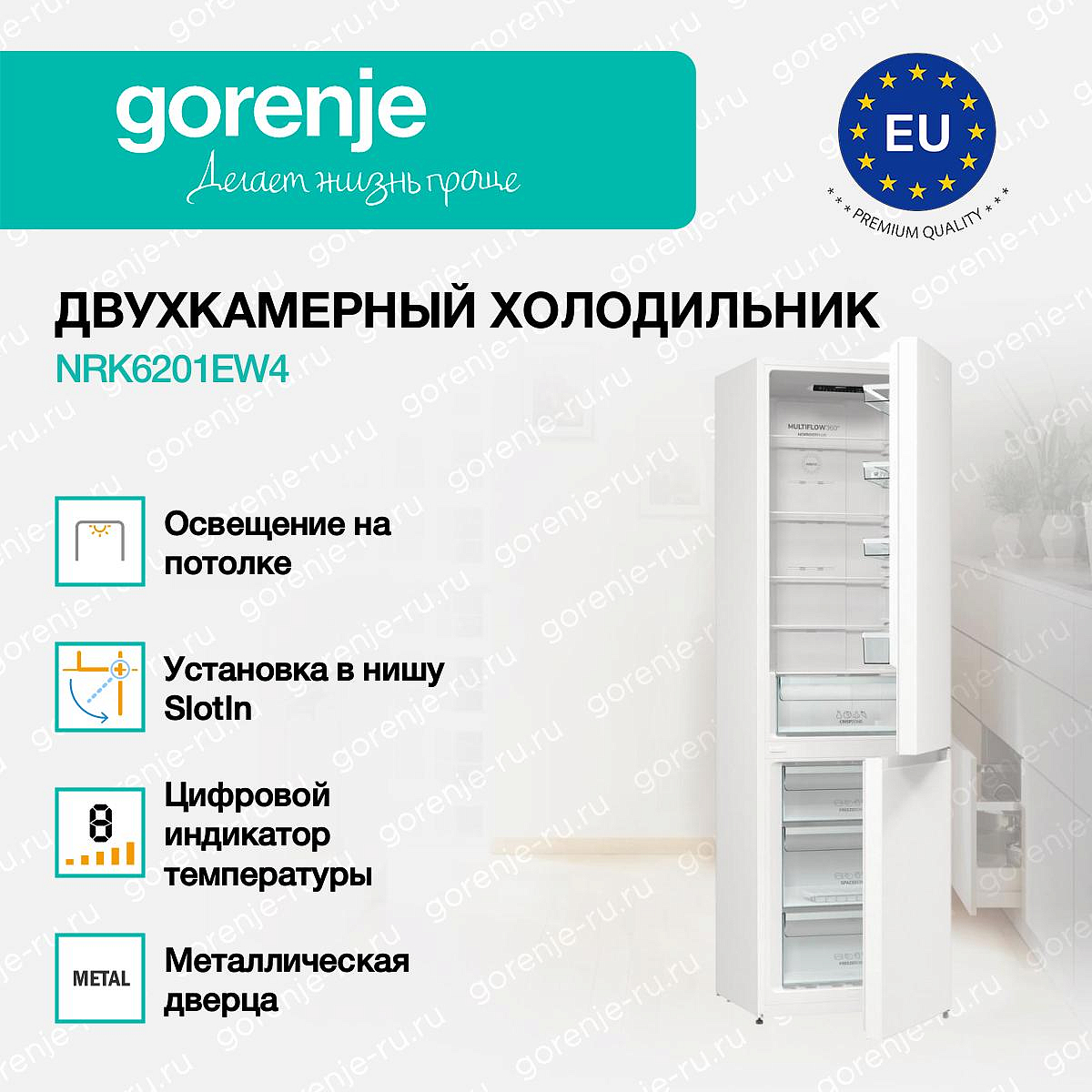 ** Все информационные материалы, представленные на Сайте, носят справочный характер и не могут в полной мере передавать достоверную информацию о свойствах, комплектации и характеристиках товара, включая цвета, размеры и формы. Фирма-производитель оставляет за собой право на внесение изменений в конструкцию, дизайн и комплектацию товара без предварительного уведомления. Перед оформлением Заказа Покупатель должен обратиться к Продавцу для уточнения свойств и характеристик Товара. Подробная информация о товаре указывается в инструкции и на упаковке товара. Используемое название в России: Горенье NRK6201EW4