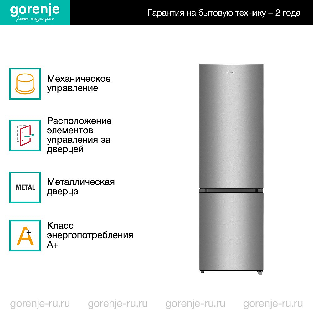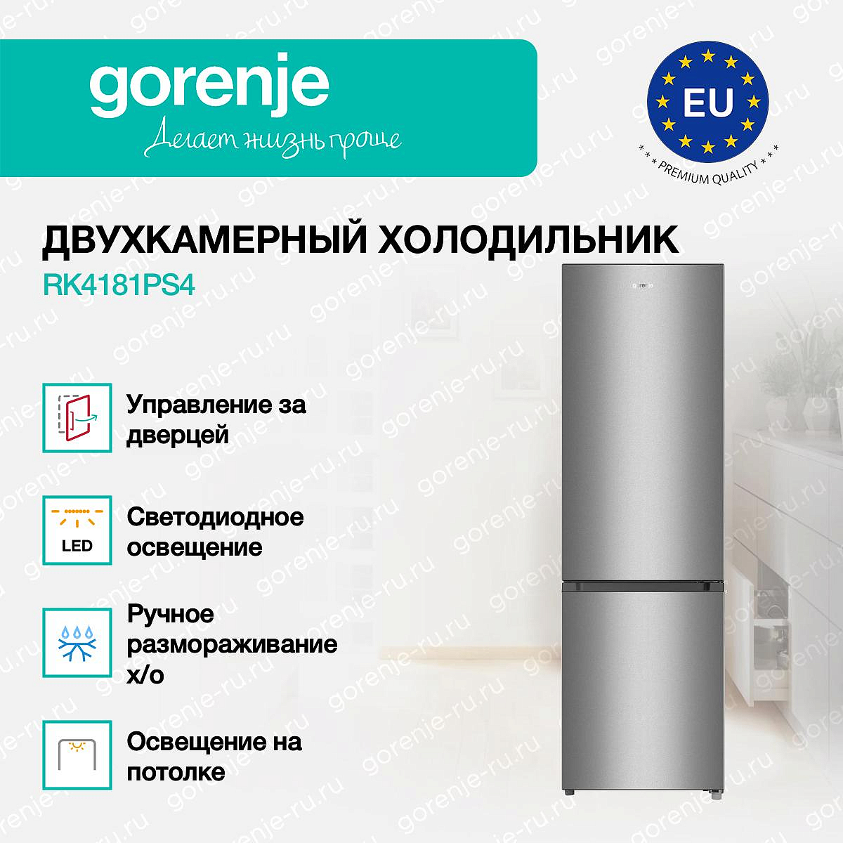 Отдельностоящий двухкамерный холодильник Gorenje RK4181PS4 выполнен в цвете нержавеющая сталь. Модель двухкамерная, с полезным объемом холодильной и морозильной камеры — 198 и 66 л. соответственно. Разморозка ручная. Дверца сделана из качественного металла. Управление механическое, а элементы удобно расположены внутри устройства. Это упрощает эксплуатацию прибора. Есть возможность выбрать необходимую вам температуру. Освещение светодиодное — оно обеспечивает равномерное распределение яркого света по всей камере вне зависимости от степени наполнения полок. При этом такие лампы служат долго, не нуждаются в замене, не греются и потребляют куда меньше электроэнергии.