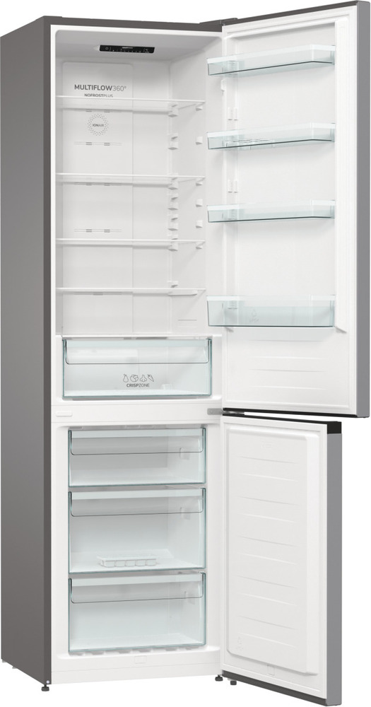 Общий объем холодильника Горение NRK6202ES4 составляет 353 л, при это 243 л приходится на холодильное отделение, а 110 л — на морозильное. В холодильной камере расположены стеклянные полки, навесные полки, отделение для хранения овощей и фруктов. Стеклянное покрытие без труда очищается от загрязнений. При мощности подключения 77 Вт мощность замораживания достигает 12 кг/сутки. Способ монтажа — скользящее крепление двери. Вы можете поменять направление открывания дверцы, так как упор переставляемый, и ее можно перевесить на другую сторону.