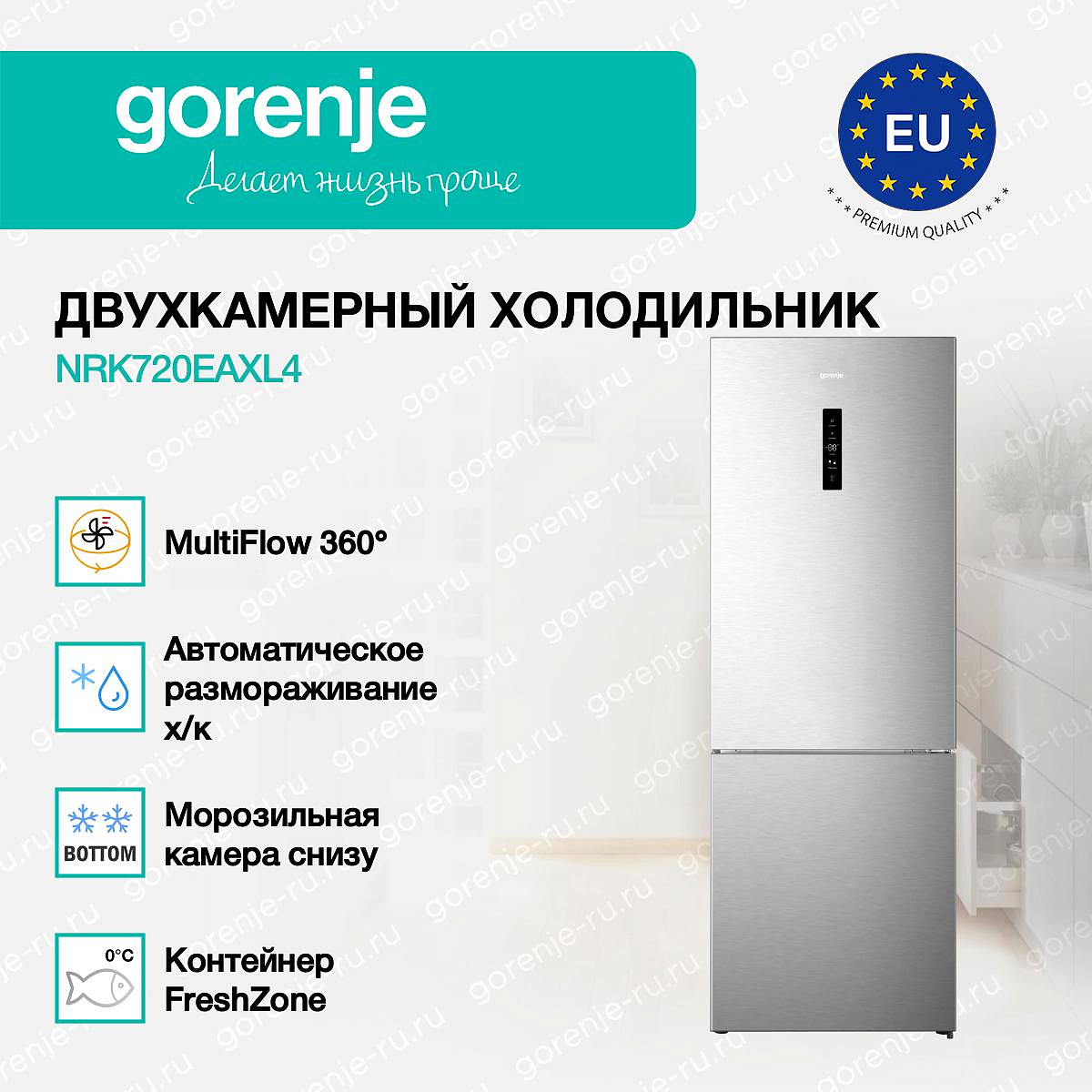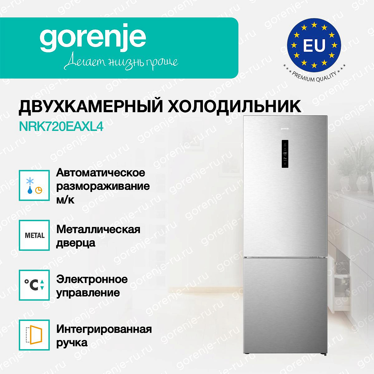 ** Все информационные материалы, представленные на Сайте, носят справочный характер и не могут в полной мере передавать достоверную информацию о свойствах, комплектации и характеристиках товара, включая цвета, размеры и формы. Фирма-производитель оставляет за собой право на внесение изменений в конструкцию, дизайн и комплектацию товара без предварительного уведомления. Перед оформлением Заказа Покупатель должен обратиться к Продавцу для уточнения свойств и характеристик Товара. Подробная информация о товаре указывается в инструкции и на упаковке товара. Используемое название в России: Горенье NRK720EAXL4