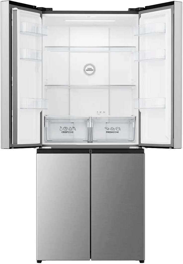 Потолочное освещение равномерно освещает все внутреннее пространство холодильника, создавая оптимальные условия для поиска продуктов. Свет падает сверху, освещая каждый уголок холодильника и минимизируя затемненные участки на полках. Потолочное освещение делает использование устройства более комфортным и упрощает доступ к продуктам, расположенным в глубине. Это особенно полезно при работе с более объемными полками, так как свет проникает вниз, улучшая видимость всех отсеков и полок.