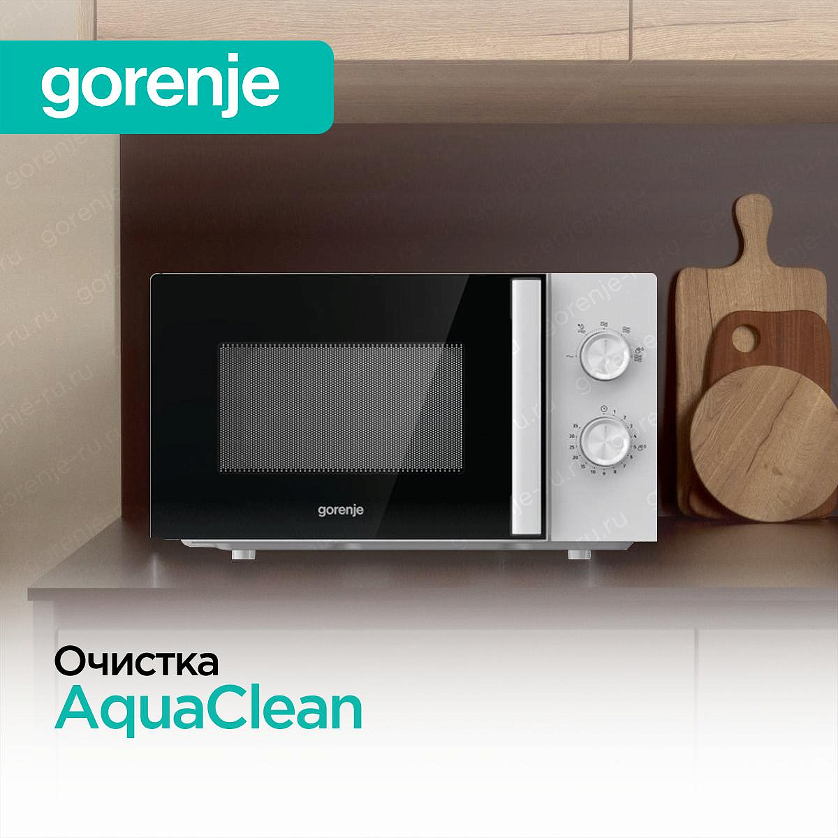Функция AquaClean в микроволновках Gorenje — это умная очистка паром для лёгкого удаления жира и нагара. Достаточно налить воду в специальную ёмкость (или просто в чашу), запустить программу — печь нагреет воду, создавая пар, который размягчит загрязнения за 10–15 минут. После — просто протрите камеру мягкой тряпкой, без агрессивных средств. Экологично, безопасно для покрытия и экономит время. Особенно удобна после готовки с брызгами или запекания.