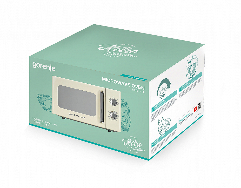 Микроволновая печь Gorenje MO20E1HRL Эта компактная бытовая единица сочетает продуманный ретро-дизайн и современные технические решения, предлагая удобство в повседневной эксплуатации и эстетичное дополнение кухонного интерьера. Внешняя передняя панель выполнена из крашеной стали в белом цвете, что придаёт изделию гладкий, аккуратный вид; ручка дверцы из стекла подчёркивает классические формы и обеспечивает удобный захват при открытии влево. Корпус аккуратно вписывается в ограниченное пространство благодаря габаритам 26.1×45.5×32.6 см и весу 10.2 кг, что делает аппарат идеальным выбором для небольших кухонь, общежитий, офисных помещений или дачных домиков.