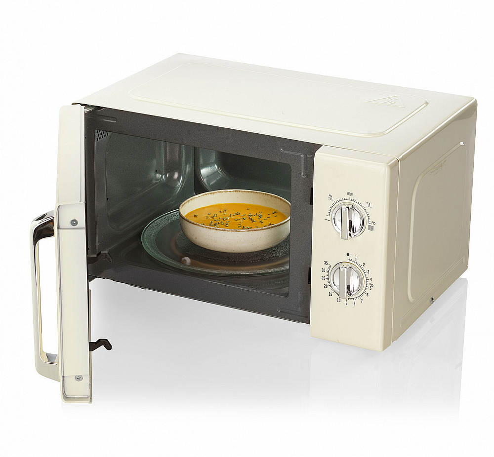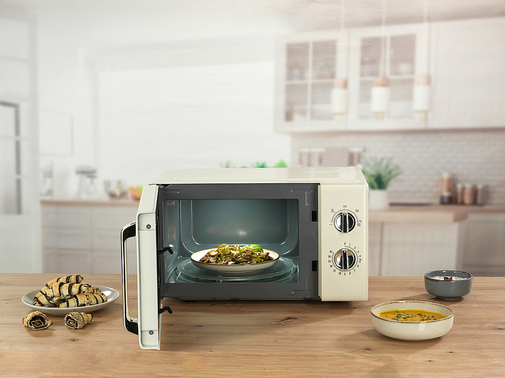 Объём рабочей камеры составляет 20 литров — оптимальный баланс между компактностью и возможностью разогрева стандартных порций, а стеклянная тарелка диаметром 255 мм обеспечивает равномерное вращение блюд на поворотном столе. Технологическая начинка ориентирована на простоту и надёжность: генерация микроволн осуществляется по стандартной схеме HVT, мощность составляет 700 Вт, при этом подключение требует присоединительной мощности 1100 Вт и номинального тока 8 А. Пользователь получает пять уровней мощности для гибкого управления процессом приготовления и функцию быстрого старта, которая позволяет сразу приступать к работе без долгих настроек. Размораживание по времени помогает аккуратно восстановить структуру продуктов перед приготовлением, а функция защитного отключения и блокировка работы при открытой дверце обеспечивают безопасность во время эксплуатации.