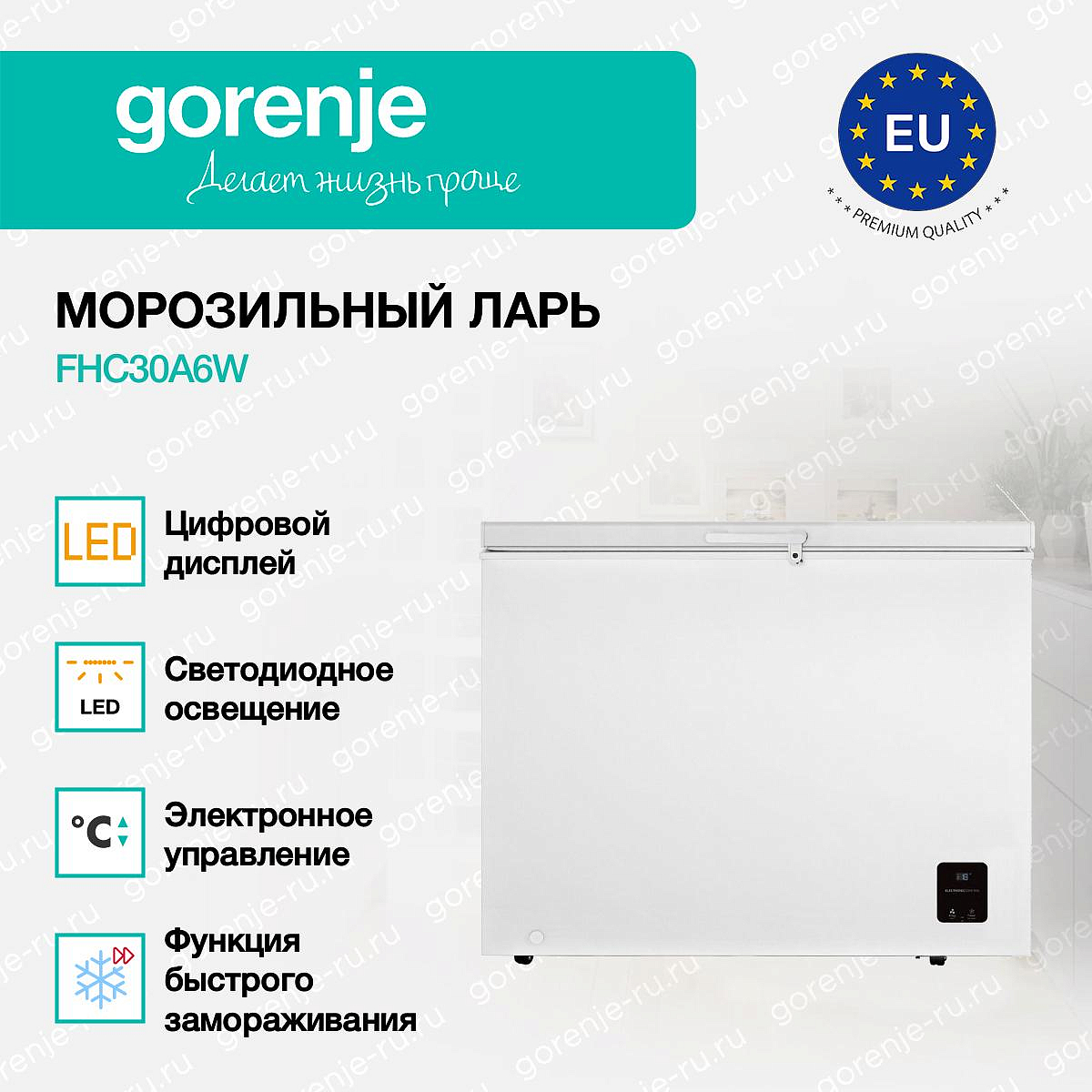 ** Все информационные материалы, представленные на Сайте, носят справочный характер и не могут в полной мере передавать достоверную информацию о свойствах, комплектации и характеристиках товара, включая цвета, размеры и формы. Фирма-производитель оставляет за собой право на внесение изменений в конструкцию, дизайн и комплектацию товара без предварительного уведомления. Перед оформлением Заказа Покупатель должен обратиться к Продавцу для уточнения свойств и характеристик Товара. Подробная информация о товаре указывается в инструкции и на упаковке товара. Используемое название в России: Горенье FHC30A6W
