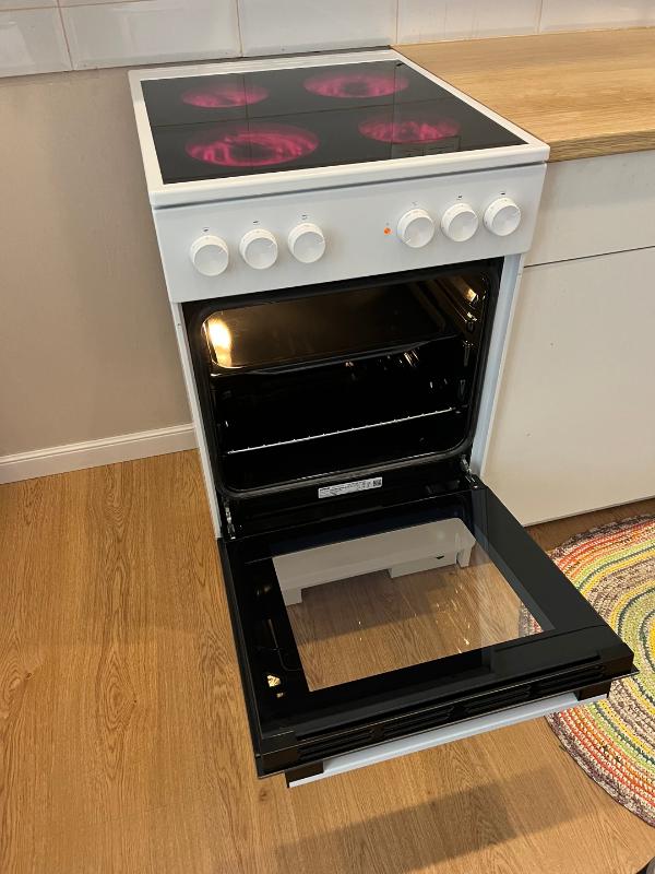 Электрическая плита выполнена в белом цвете, что помогает ей гармонично вписаться в любой интерьер. Варочная поверхность изготовлена из стеклокерамики, что обеспечивает ей долговечность и удобство в уходе. Панель управления и дверца плиты выполнены из крашеного металла, что придает устройству прочность и надежность. Дверца оснащена стеклянной вставкой, что помогает наблюдать за процессом приготовления пищи. Внутреннее освещение делает эксплуатация плиты еще более комфортным. Фурнитура также выполнена в белом цвете, что создает единый стильный образ.