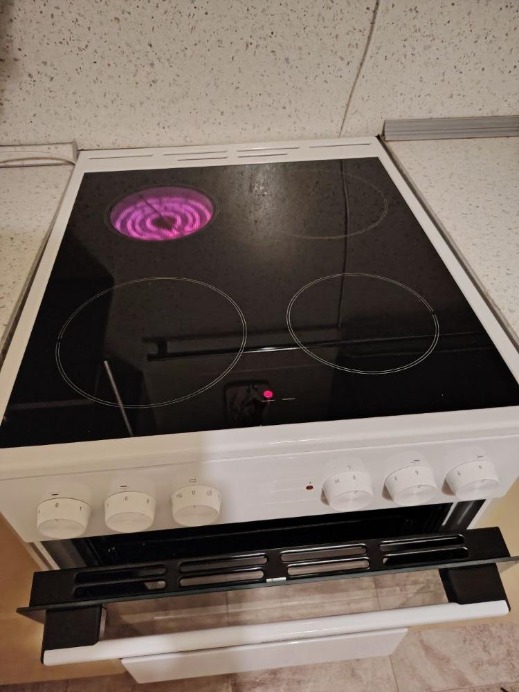 Электрическая плита выполнена в классическом белом цвете, что дает ей идеально вписаться в любой интерьер. Варочная поверхность изготовлена из стеклокерамики - материала, обладающего высокой прочностью и устойчивостью к механическим повреждениям. Модели не имеет крышки, что обеспечивает удобство эксплуатация. Панель управления и дверца духовки изготовлены из крашеного металла, что гарантирует их долговечность. Дверца дополнительно декорирована стеклянной вставкой, придающей эстетичный внешний вид. Фурнитура также выполнена в белом цвете, создавая гармоничный общий образ. Внутреннее освещение обеспечивает комфорт в процессе приготовления пищи.