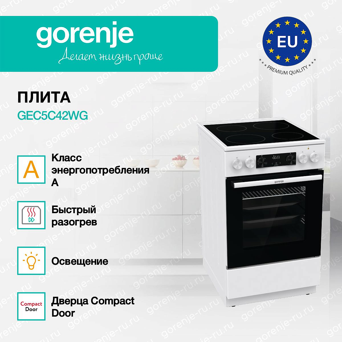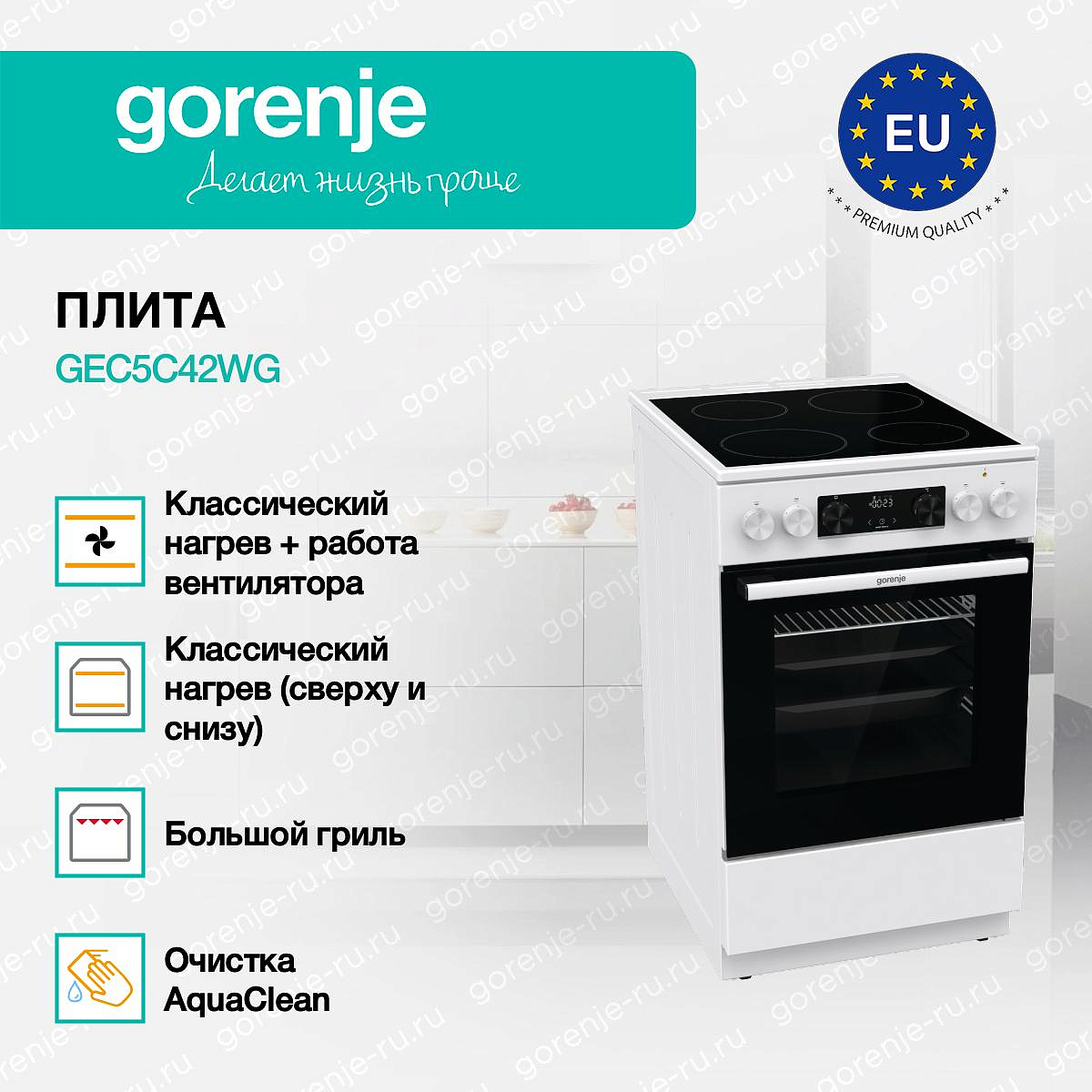 ** Все информационные материалы, представленные на Сайте, носят справочный характер и не могут в полной мере передавать достоверную информацию о свойствах, комплектации и характеристиках товара, включая цвета, размеры и формы. Фирма-производитель оставляет за собой право на внесение изменений в конструкцию, дизайн и комплектацию товара без предварительного уведомления. Перед оформлением Заказа Покупатель должен обратиться к Продавцу для уточнения свойств и характеристик Товара. Подробная информация о товаре указывается в инструкции и на упаковке товара. Используемое название в России: Горенье GEC5C42WG