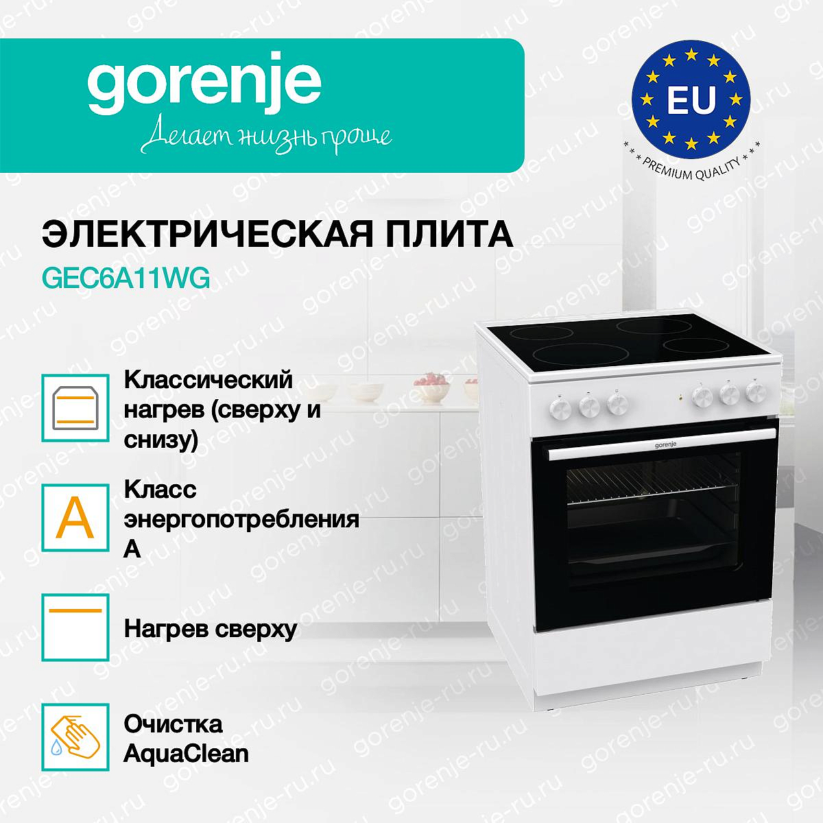 ** Все информационные материалы, представленные на Сайте, носят справочный характер и не могут в полной мере передавать достоверную информацию о свойствах, комплектации и характеристиках товара, включая цвета, размеры и формы. Фирма-производитель оставляет за собой право на внесение изменений в конструкцию, дизайн и комплектацию товара без предварительного уведомления. Перед оформлением Заказа Покупатель должен обратиться к Продавцу для уточнения свойств и характеристик Товара. Подробная информация о товаре указывается в инструкции и на упаковке товара. Используемое название в России: Горенье GEC6A11WG