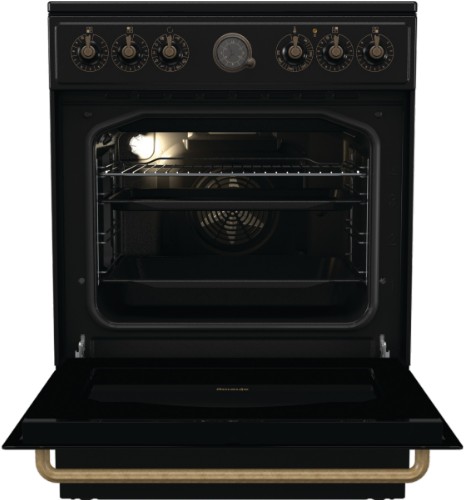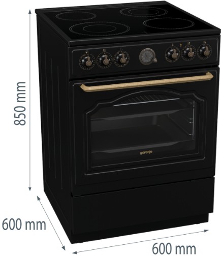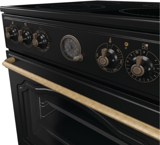 Модель выполнена в стильном черном цвете, что придает ей современный и элегантный вид. Варочная поверхность из стеклокерамики не только устойчива к царапинам и высоким температурам, но и легко очищается от грязи и жира, что облегчает уход за плитой. Панель управления и дверца духовки из крашеного металла, дополненные стеклянной вставкой, выглядят стильно и современно. Бронзовая фурнитура придает плите изысканный и роскошный вид. Внутреннее освещение духового шкафа обеспечивает отличную видимость блюд в процессе приготовления, что дает контролировать их готовность.