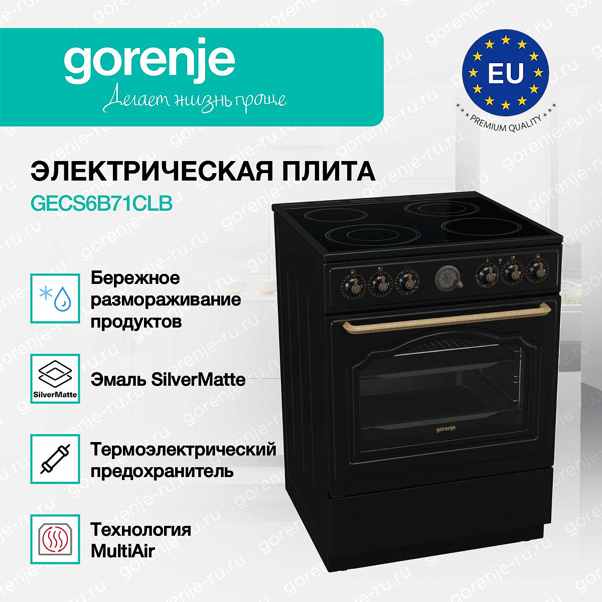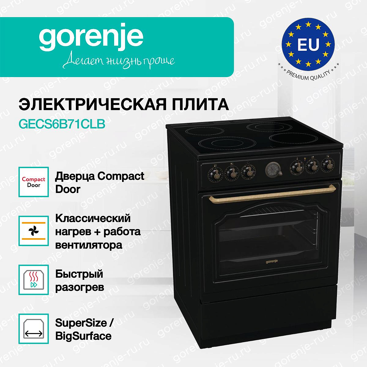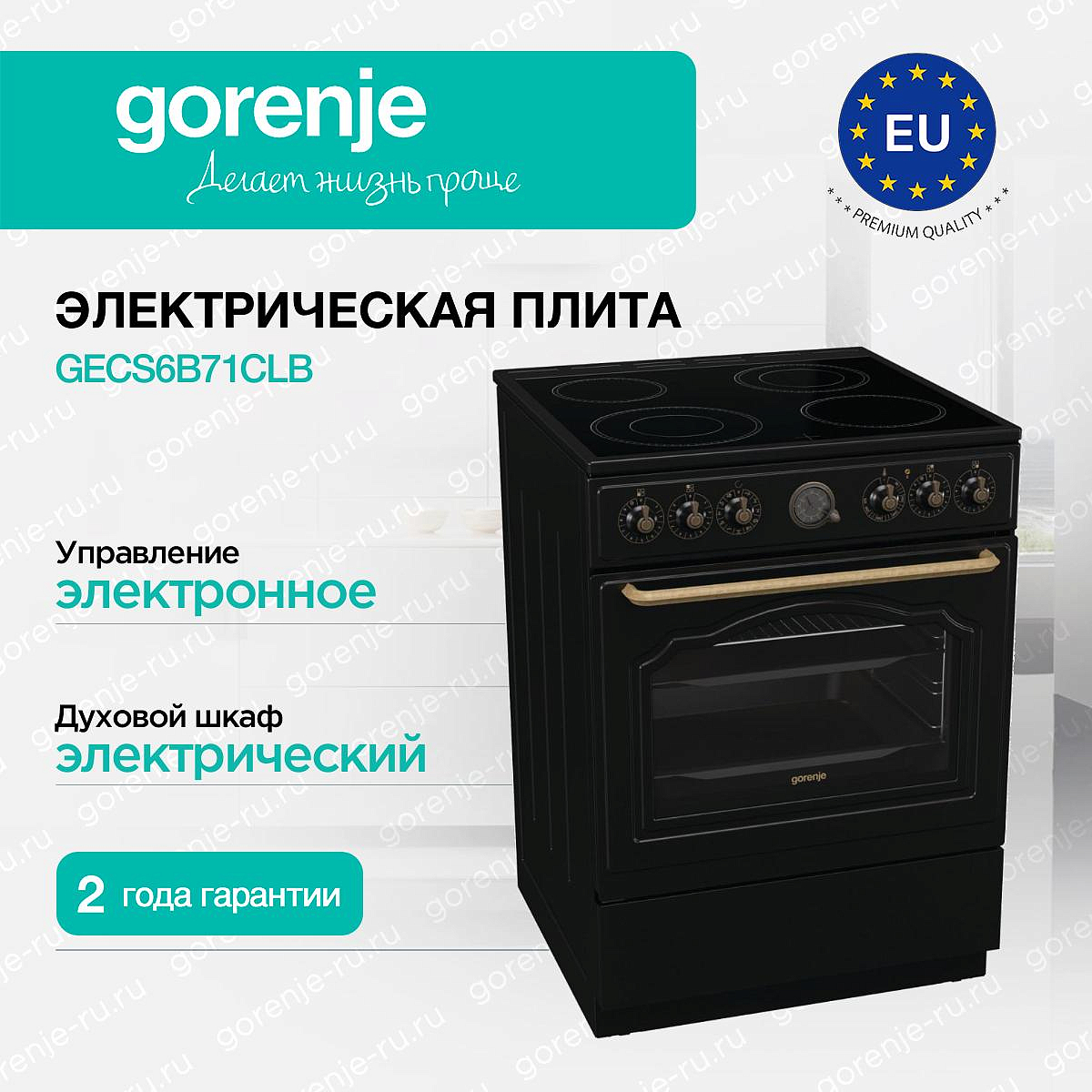 ** Все информационные материалы, представленные на Сайте, носят справочный характер и не могут в полной мере передавать достоверную информацию о свойствах, комплектации и характеристиках товара, включая цвета, размеры и формы. Фирма-производитель оставляет за собой право на внесение изменений в конструкцию, дизайн и комплектацию товара без предварительного уведомления. Перед оформлением Заказа Покупатель должен обратиться к Продавцу для уточнения свойств и характеристик Товара. Подробная информация о товаре указывается в инструкции и на упаковке товара. Используемое название в России: Горенье GECS6B71CLB