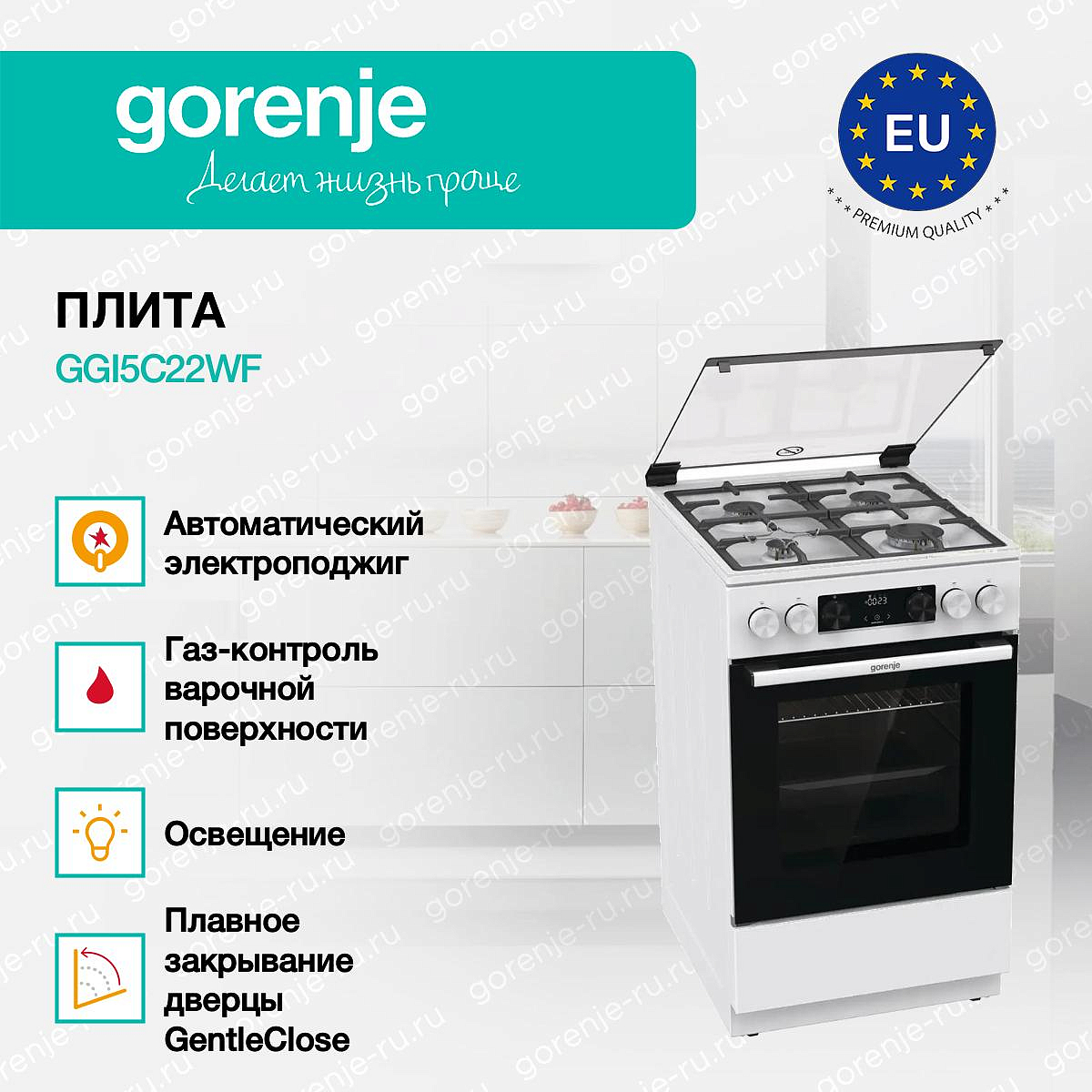 ** Все информационные материалы, представленные на Сайте, носят справочный характер и не могут в полной мере передавать достоверную информацию о свойствах, комплектации и характеристиках товара, включая цвета, размеры и формы. Фирма-производитель оставляет за собой право на внесение изменений в конструкцию, дизайн и комплектацию товара без предварительного уведомления. Перед оформлением Заказа Покупатель должен обратиться к Продавцу для уточнения свойств и характеристик Товара. Подробная информация о товаре указывается в инструкции и на упаковке товара. Используемое название в России: Горенье GGI5C22WF