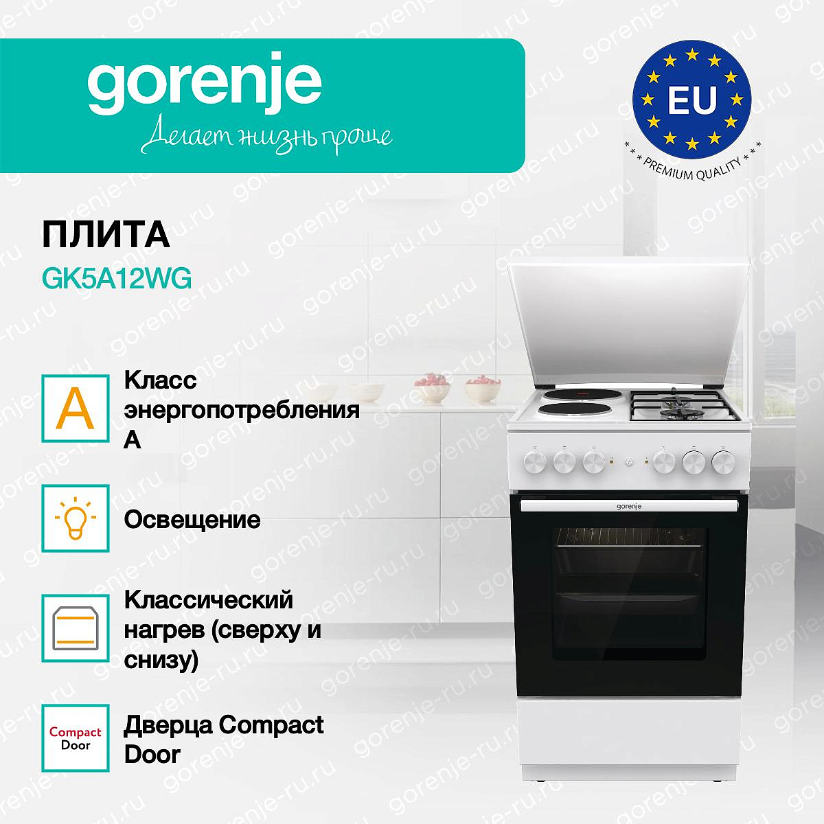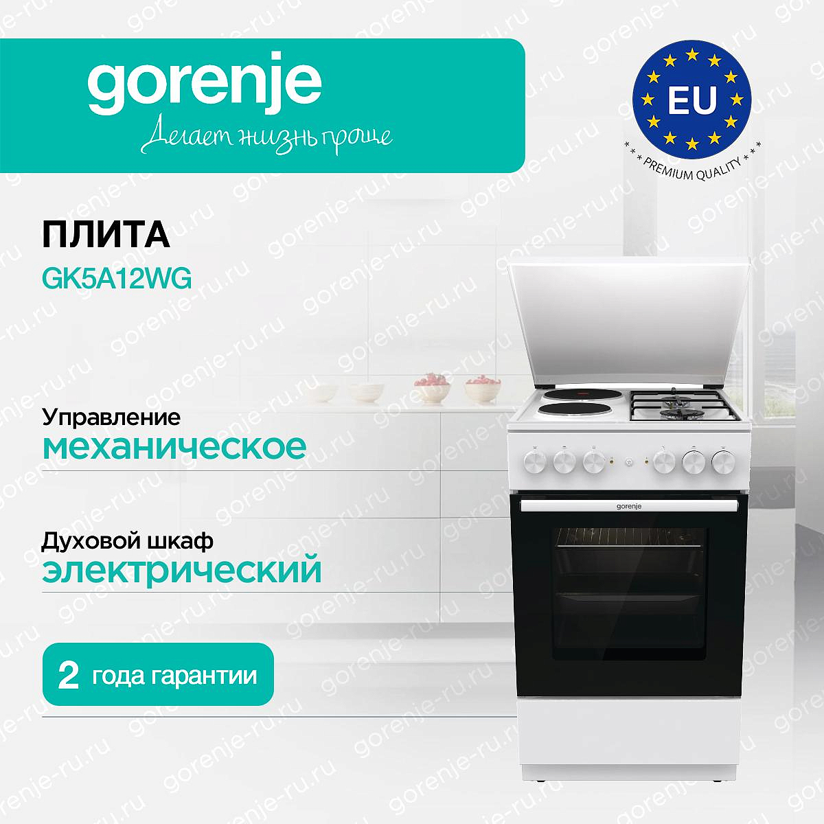 ** Все информационные материалы, представленные на Сайте, носят справочный характер и не могут в полной мере передавать достоверную информацию о свойствах, комплектации и характеристиках товара, включая цвета, размеры и формы. Фирма-производитель оставляет за собой право на внесение изменений в конструкцию, дизайн и комплектацию товара без предварительного уведомления. Перед оформлением Заказа Покупатель должен обратиться к Продавцу для уточнения свойств и характеристик Товара. Подробная информация о товаре указывается в инструкции и на упаковке товара. Используемое название в России: Горенье GK5A12WG