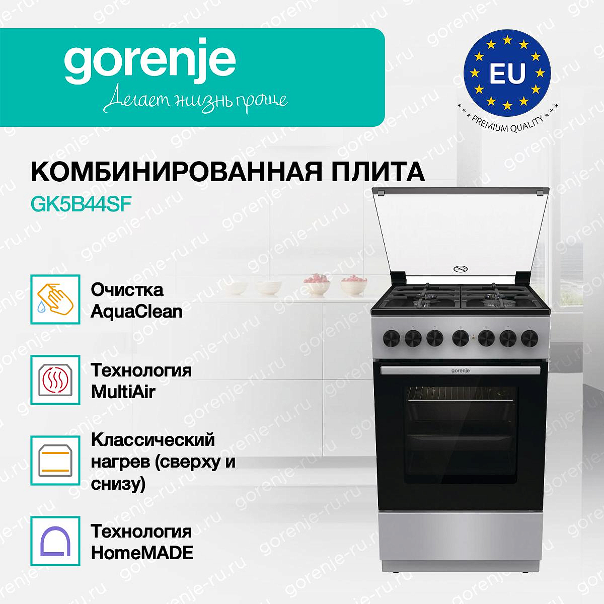 ** Все информационные материалы, представленные на Сайте, носят справочный характер и не могут в полной мере передавать достоверную информацию о свойствах, комплектации и характеристиках товара, включая цвета, размеры и формы. Фирма-производитель оставляет за собой право на внесение изменений в конструкцию, дизайн и комплектацию товара без предварительного уведомления. Перед оформлением Заказа Покупатель должен обратиться к Продавцу для уточнения свойств и характеристик Товара. Подробная информация о товаре указывается в инструкции и на упаковке товара. Используемое название в России: Горенье GK5B44SF