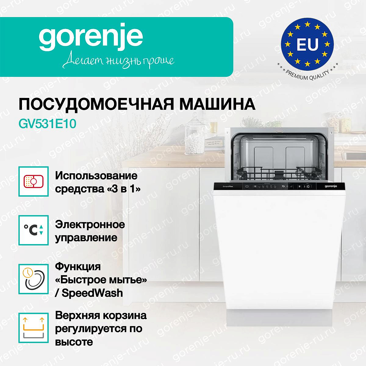 ** Все информационные материалы, представленные на Сайте, носят справочный характер и не могут в полной мере передавать достоверную информацию о свойствах, комплектации и характеристиках товара, включая цвета, размеры и формы. Фирма-производитель оставляет за собой право на внесение изменений в конструкцию, дизайн и комплектацию товара без предварительного уведомления. Перед оформлением Заказа Покупатель должен обратиться к Продавцу для уточнения свойств и характеристик Товара. Подробная информация о товаре указывается в инструкции и на упаковке товара. Используемое название в России: Горенье GV531E10