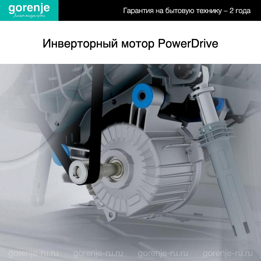 Стиральная машина Gorenje W2NHPI62SCS полностью белого цвета — и корпус, и загрузочный люк. Это компактная модель, ее глубина составляет всего 43,5 см. При этом ширина прибора — 59,7 см а высота — 85 см. Так как устройство устанавливается отдельно, его можно поставить в любом месте, где есть доступ к водопроводу и канализации, даже в коридоре. Инверторный мотор за счет конструкции, в которой нет щеток и ремней, очень долговечный. К тому же он работает тише других моделей, ведь в нем нет частей, которые трутся друг о друга.