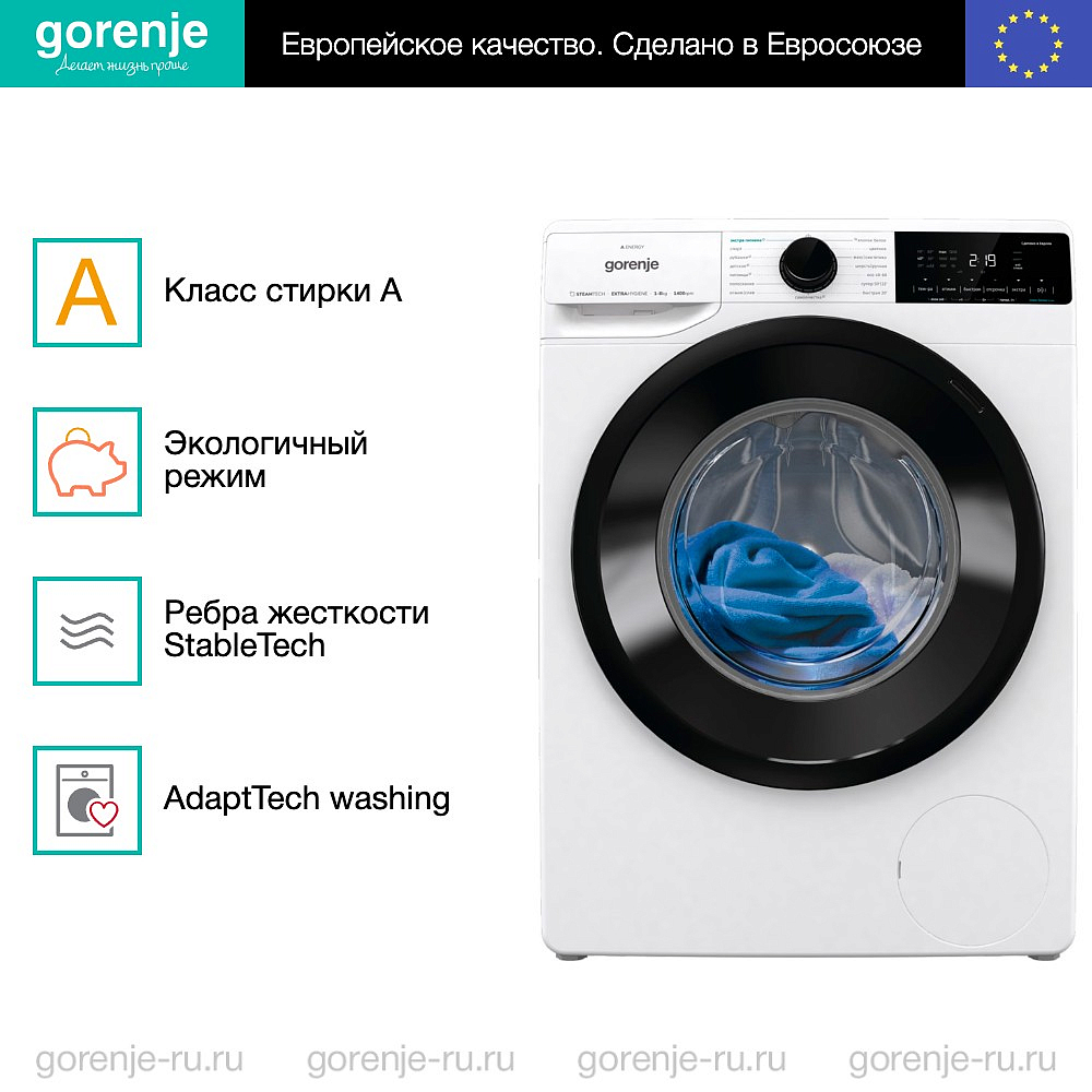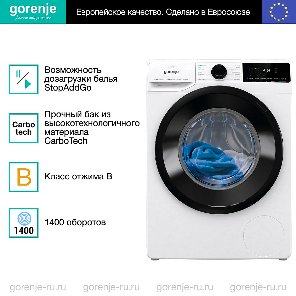 Представляем Вашему вниманию стиральную машину Gorenje WNA84ACIS из дизайн-линии Advanced. Этот прибор станет незаменимым помощником в Вашем доме, обеспечивая безупречное качество стирки и заботу о Ваших вещах. Аппарат выполнена в классическом белом цвете, который подойдет к любому интерьеру. Контрастный черный цвет загрузочного люка добавляет элегантности и современного шика. Фронтальная загрузка обеспечивает удобство использования и помогает разместить машину даже в небольшом помещении. Особенностью этого устройства является вместительный барабан объемом 54 литра, позволяющий загрузить до 8 кг хлопковых изделий. Это делает машину идеальной для больших семей или тех, кто предпочитает стирать большое количество вещей за один раз. Максимальное количество оборотов отжима составляет 1400 об./мин. Такая мощность обеспечивает отличное качество отжима, сокращая время сушки белья после стирки. Мы являемся официальным дилером бренда Gorenje, что гарантирует качество и надежность приобретаемого у нас оборудования. В следующем разделе мы расскажем Вам подробнее об особенностях и функциях стиральной машины Gorenje WNA84ACIS.