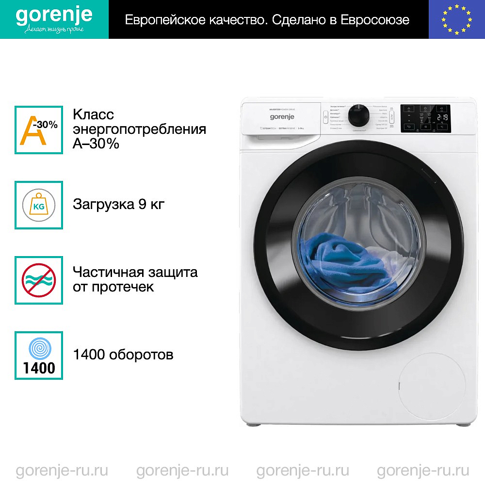 Откройте для себя новую эру стирки с превосходной стиральной машиной Gorenje WNA94ACIS. Мы, как официальный дилер Gorenje, рады представить вам это инновационное устройство, которая сочетает в себе продвинутые технологии и элегантный дизайн. Эта стиралка принадлежит к дизайн-линии Advanced, что означает, что она не только обеспечивает непревзойденные результаты стирки, но и выглядит исключительно стильно. Белый цвет корпуса идеально сочетается с черным цветом загрузочного люка, создавая современный и элегантный внешний вид, который будет гармонично смотреться в любом интерьере. Машинка Gorenje WNA94ACIS оснащена фронтальной загрузкой, что делает ее удобной и практичной в эксплуатации. Максимальная загрузка составляет 9 кг хлопка, что делает это устройство идеальной для больших семей или тех, кто часто стирает большие объемы белья. Но это еще не все. Эта техника может развивать максимальное количество оборотов отжима до 1400 об./мин., обеспечивая тщательный и эффективный отжим вашего белья. Объем барабана составляет 64 литра, что помогает загружать большое количество белья за один цикл стирки. В следующих разделах мы подробнее расскажем о всех функциях и преимуществах стиральной машины Gorenje WNA94ACIS. Приготовьтесь к тому, что ваши представления о стирке изменятся навсегда!