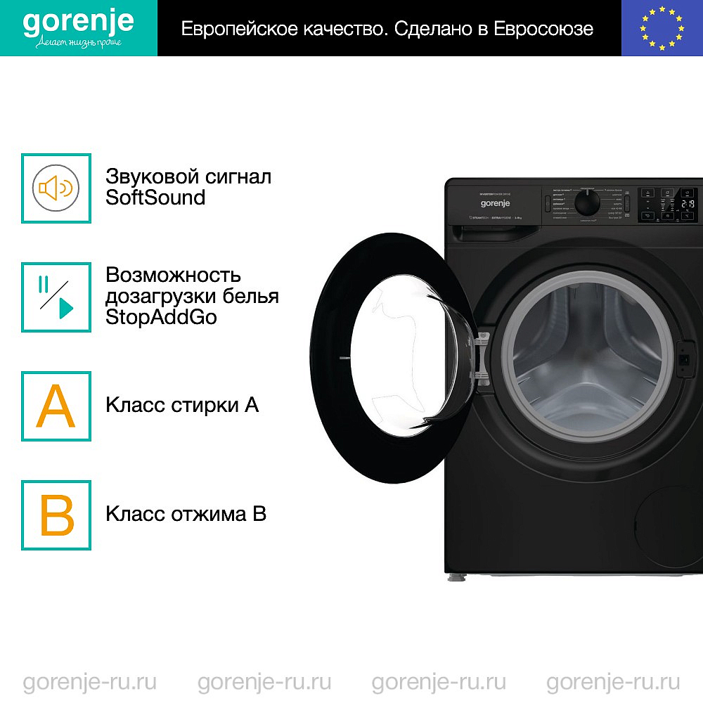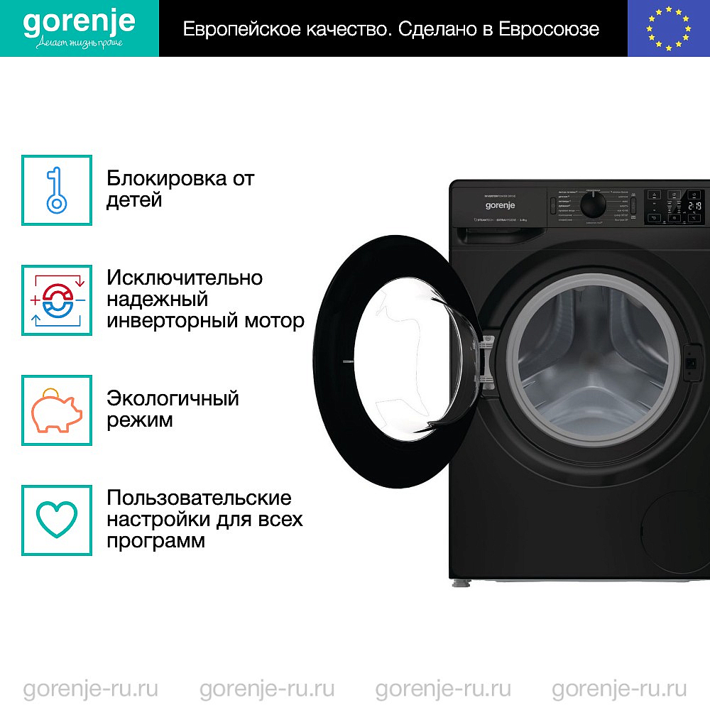 Стиральная машина Gorenje WNEI94AS/BCIS — современная модель в классическом черном цвете, которая органично впишется в интерьер помещения. Устройство имеет 16 режимов работы, благодаря чему справится с большинством видов пятен и тканей. Программа «Экстрагигиена» удалит до 99,9% бактерий и грибков, используя пар и высокую температуру. С помощью функции StopAddGo можно приостановить программу на начальном этапе, чтобы добавить или извлечь белье. Во время стирки дверца стиральной машины заблокирована, чтобы ее не могли открыть дети.