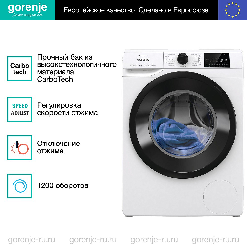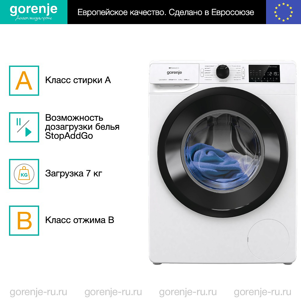Представляем вам стиральную машину Essential от всемирно известного производителя бытовой техники Gorenje. Эта модель, выполненная в классическом белом цвете, станет настоящим украшением вашей ванной комнаты или прачечной. А черный загрузочный люк придает ей особый шик и изысканность. Машина оснащена фронтальной загрузкой, что облегчает процесс укладки белья. Максимальная загрузка составляет 7 кг хлопка, что позволит вам стирать большое количество вещей за один раз. Так, вам не придется тратить лишнее время на разделение белья на маленькие порции. Максимальное количество оборотов отжима достигает 1200 об./мин. Это означает, что ваше белье будет почти сухим после стирки, что существенно сократит время его сушки. Объем барабана составляет 49 литров. Это достаточно для стирки большого количества белья, включая большие вещи, такие как постельное белье или пледы. Мы являемся официальными дилерами Gorenje и гарантируем высокое качество всех представленных товаров. В следующих разделах вы найдете подробное описание всех функций и возможностей этой стиральной машины.