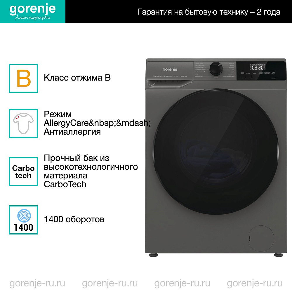 Встречайте новинку в ассортименте стирально-сушильных машин - модель Gorenje W2D2A164ADSS. Этот функциональный и надежный прибор в современном стильном исполнении цвета титан станет отличным решением для тех, кто ценит комфорт и качество в быту. Тип загрузки в этой модели - фронтальная, что делает процесс стирки и сушки белья максимально удобным и простым. Благодаря вместительному барабану объемом в 66 литров, машина способна одновременно стирать до 10 кг хлопка, что дает справиться даже с большим количеством белья. При этом загрузка при сушке составляет 6 кг, что также является впечатляющим показателем. Одним из преимуществ данной модели является максимальное количество оборотов отжима - 1400 об./мин. Это обеспечивает эффективное удаление влаги из белья и сокращает время, необходимое для его сушки. Мы, как официальный дилер Gorenje, гарантируем вам высокое качество и оригинальность данной модели. Но на этом наши предложения не заканчиваются. Продолжайте чтение, чтобы узнать больше о функциях и преимуществах стирально-сушильной машины Gorenje W2D2A164ADSS.
