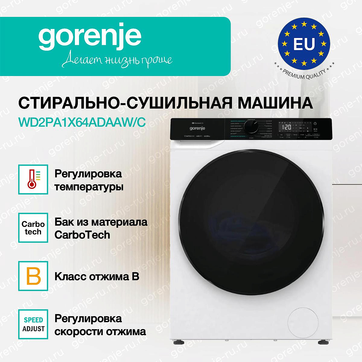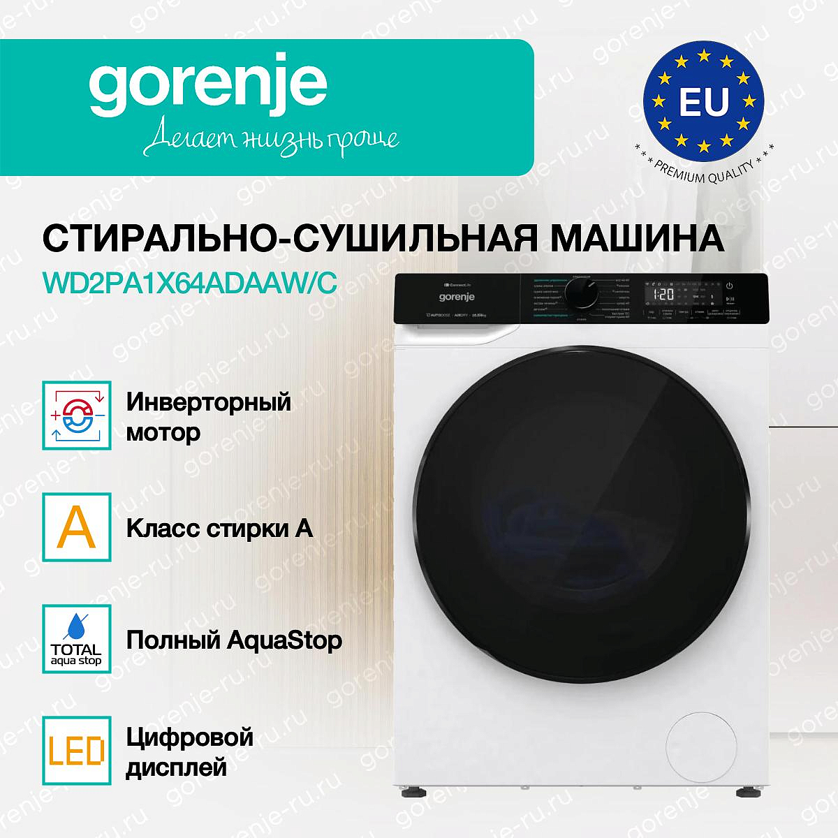 ** Все информационные материалы, представленные на Сайте, носят справочный характер и не могут в полной мере передавать достоверную информацию о свойствах, комплектации и характеристиках товара, включая цвета, размеры и формы. Фирма-производитель оставляет за собой право на внесение изменений в конструкцию, дизайн и комплектацию товара без предварительного уведомления. Перед оформлением Заказа Покупатель должен обратиться к Продавцу для уточнения свойств и характеристик Товара. Подробная информация о товаре указывается в инструкции и на упаковке товара. Используемое название в России: Горенье WD2PA1X64ADAAW/C