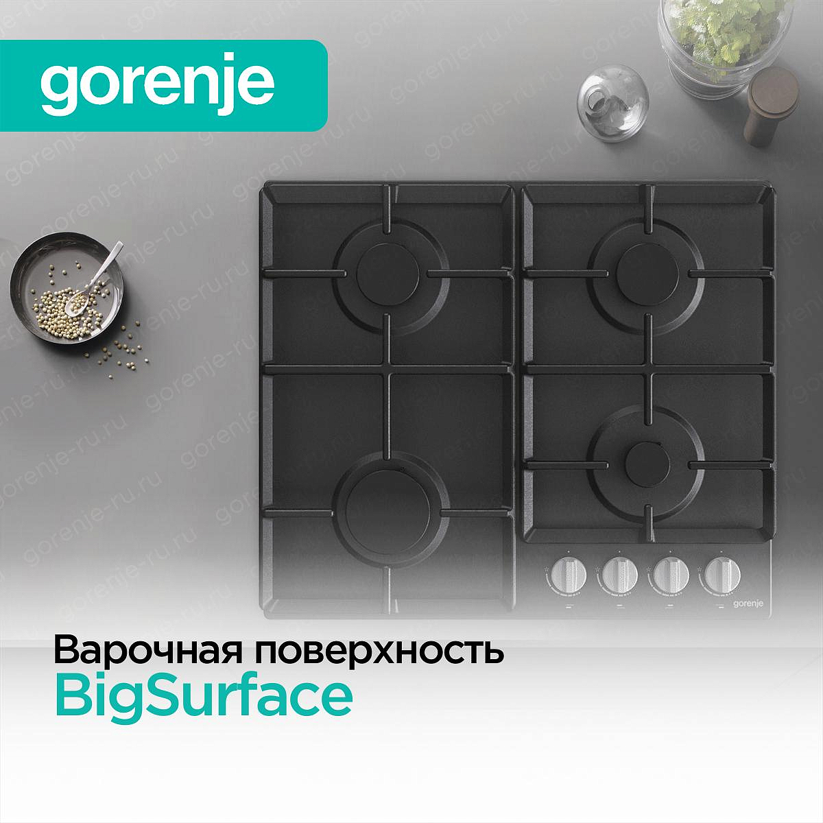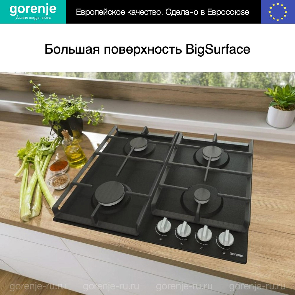 Для безопасной работы предусмотрена система газ-контроля, которая автоматически прекращает подачу газа при случайном затухании пламени. Встроенный электроподжиг упрощает включение конфорок и делает использование плиты более удобным. Плита Горение оснащена функцией BigSurface, которая предлагает большую рабочую зону для размещения различных кухонных ёмкостей, что особенно полезно при готовке нескольких блюд или использовании крупной посуды.