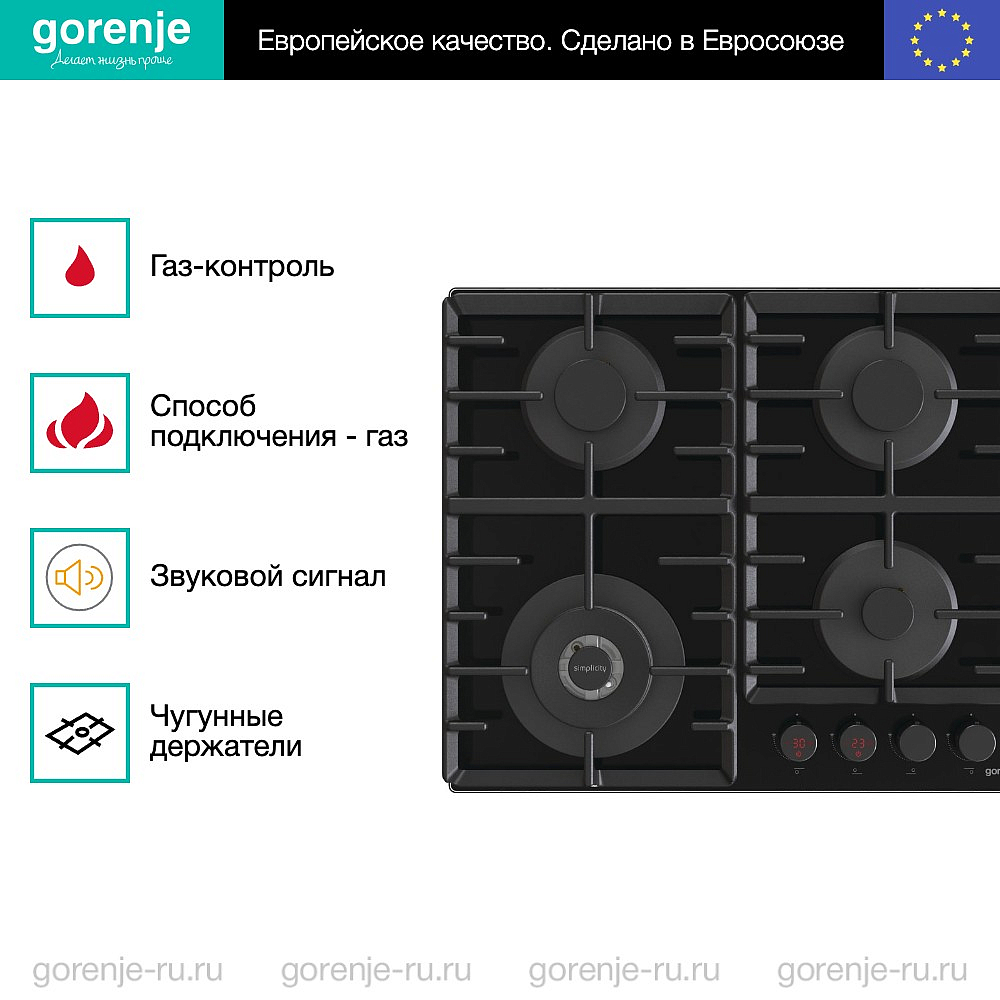 Независимая газовая варочная панель Горенье GKTW642SYB использует природный газ. В нем отсутствует оксид углерода, что исключает возможность отравления, и делает его эксплуатацию намного экологичнее. Для воздействия на элементы управления требуется минимальное усилие, а расположены они с учетом комфорта пользователя.