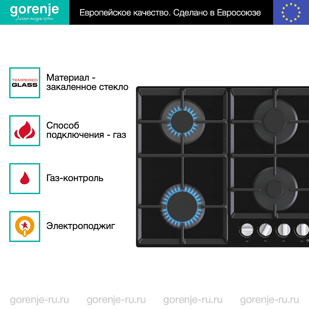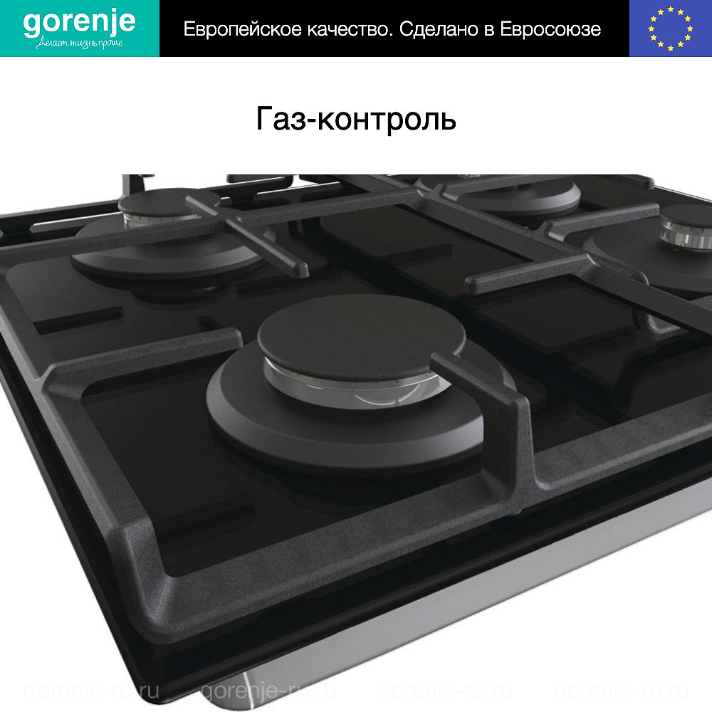 Варочная панель Горение оснащена функцией газ-контроль, которая обеспечивает безопасность использования, автоматически перекрывая подачу газа в случае случайного погашения пламени на конфорках.