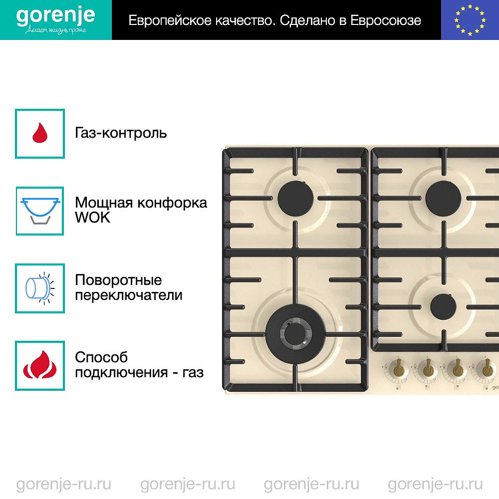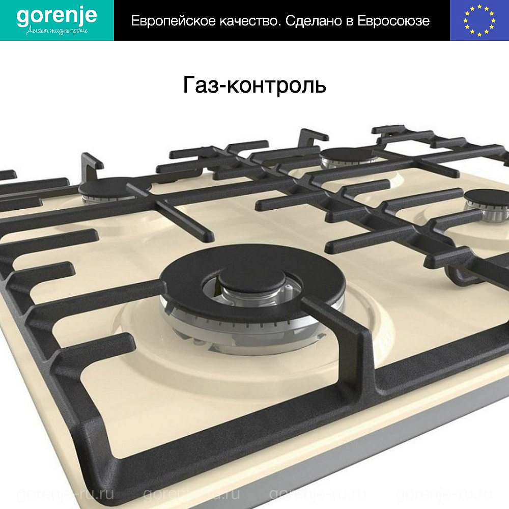 Независимая газовая варочная панель Gorenje GW642CLI отличается от многих схожих по функциональности моделей необычным цветом — слоновая кость. Также необходимо обратить внимание на поворотные регуляторы, выкрашенные под бронзу и выполненные по форме, как старинные вентильные краны. Это яркий признак эстетичной дизайнерской линейки Classico. Она вобрала в себя ретро-стилистику и классические функции, которые все вместе очень полюбились многим пользователям.
