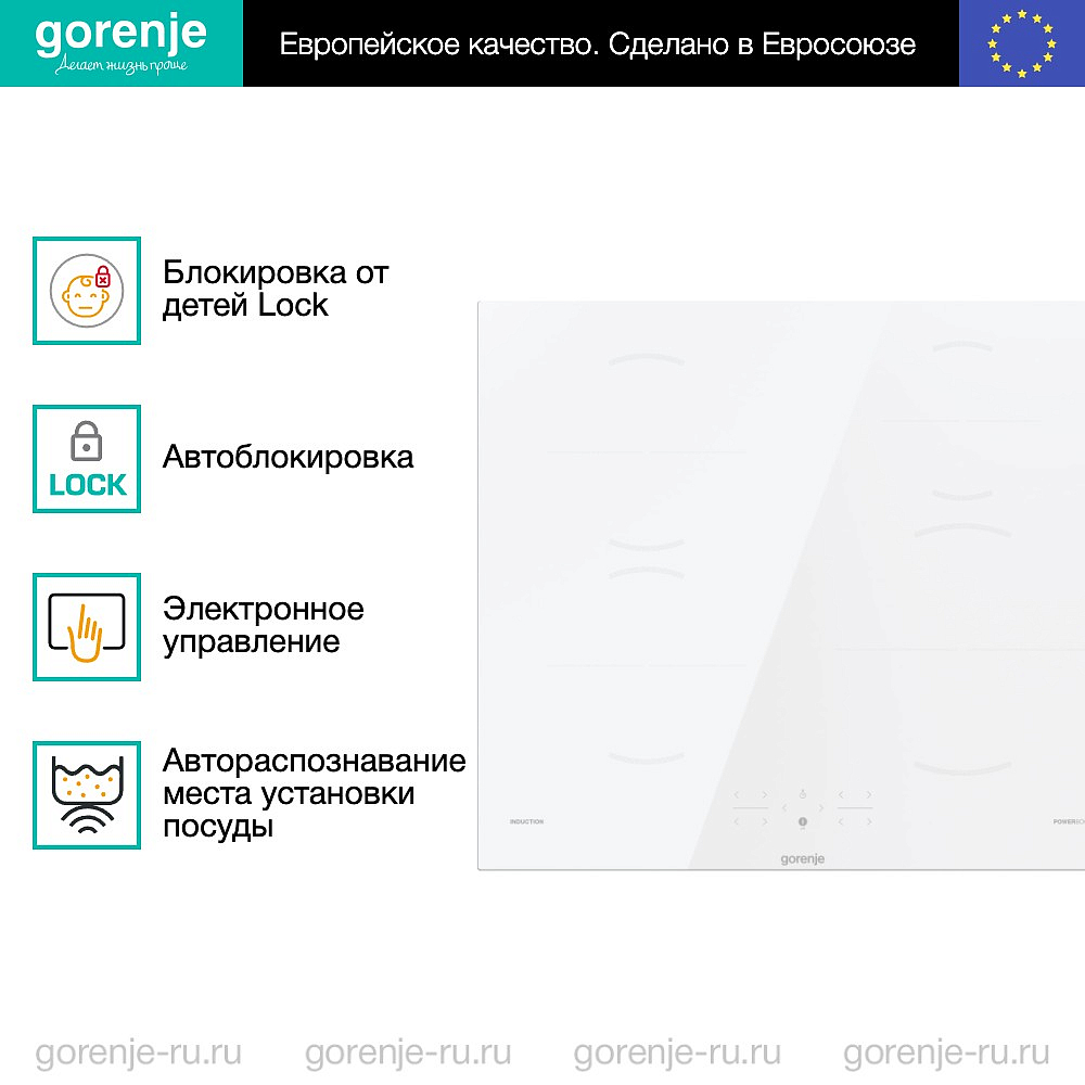 Независимая индукционная варочная панель Горенье GI6401WSC оснащена 4 конфорками, на каждой из которых присутствуют функция PowerBoost, кратковременно увеличивающая мощность до 50%, что сокращает время приготовления, и функция автоматического распознавания места установки утвари. С автоматическим распознаванием места установки посуды после определения, где стоит кастрюля или сковорода, нагрев данной зоны включится автоматически. При помощи сенсорной панели можно выставить необходимую мощность для каждой конфорки и настроить таймер. В зависимости от выбранных вами настроек, по истечении времени, таймер или подаст звуковой сигнал, или выключит конфорку. Во время приготовления можно изменить мощность нагрева.