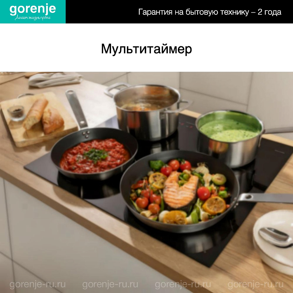 Независимая индукционная варочная панель Горенье ISC645BSC имеет возможность объединять несколько конфорок в одну. За счет этого увеличивается площадь нагрева и мощность. Используйте эту опцию если вам нужно приготовить блюдо в большой кастрюле. Есть автораспознавание места, где установлена посуда. Можно настроить таймер. Задайте определенный промежуток времени и занимайтесь другими домашними делами. Прибор оповестит вас о том, что конфорку пора выключить. Есть специальный режим для разморозки еды. С его помощью вы быстро подготовите ее к запеканию. При этом, продукты сохранят свою форму и полезные свойства.
