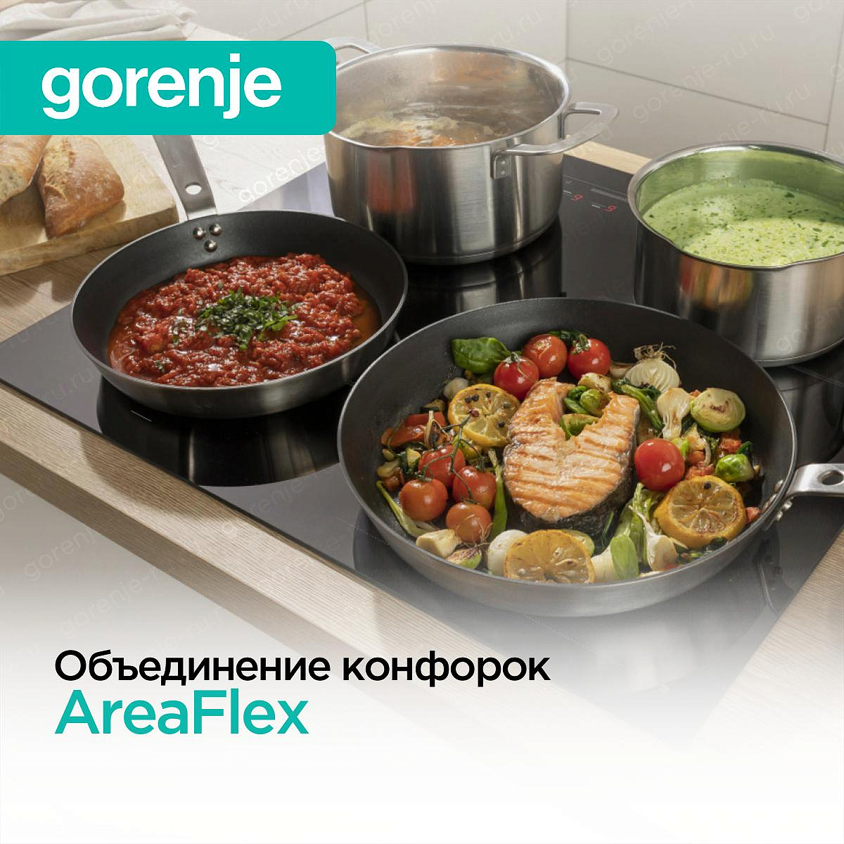 AreaFlex имеет второе название — Flexi. Это технология, которая позволяет объединить две соседствующие конфорки в одну прямоугольную с помощью моста. Таким образом, пользователь получает вытянутую зону нагрева. На ней можно использовать посуду с овальным или прямоугольным дном. В зависимости от модели на такой зоне можно использовать функцию Booster.