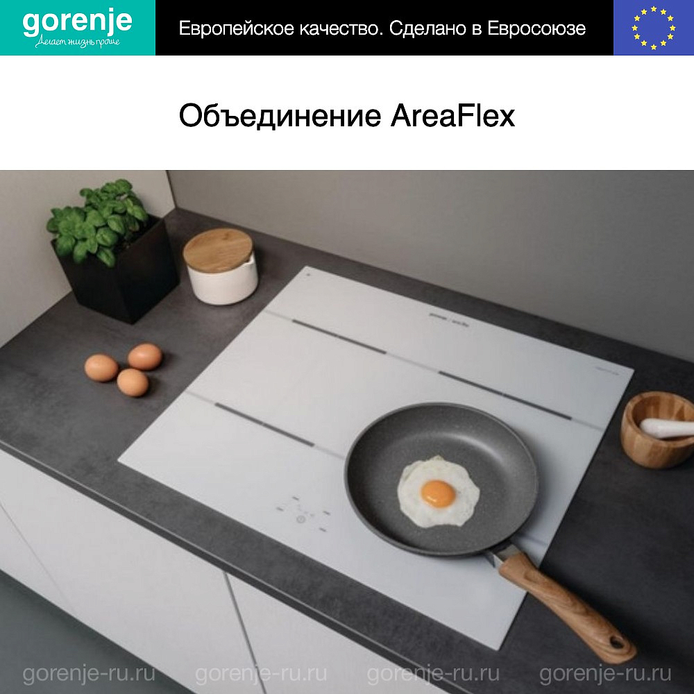 AreaFlex имеет второе название — Flexi. Это технология, которая позволяет объединить две соседствующие конфорки в одну прямоугольную с помощью моста. Таким образом, пользователь получает вытянутую зону нагрева. На ней можно использовать посуду с овальным или прямоугольным дном. В зависимости от модели на такой зоне можно использовать функцию Booster.
