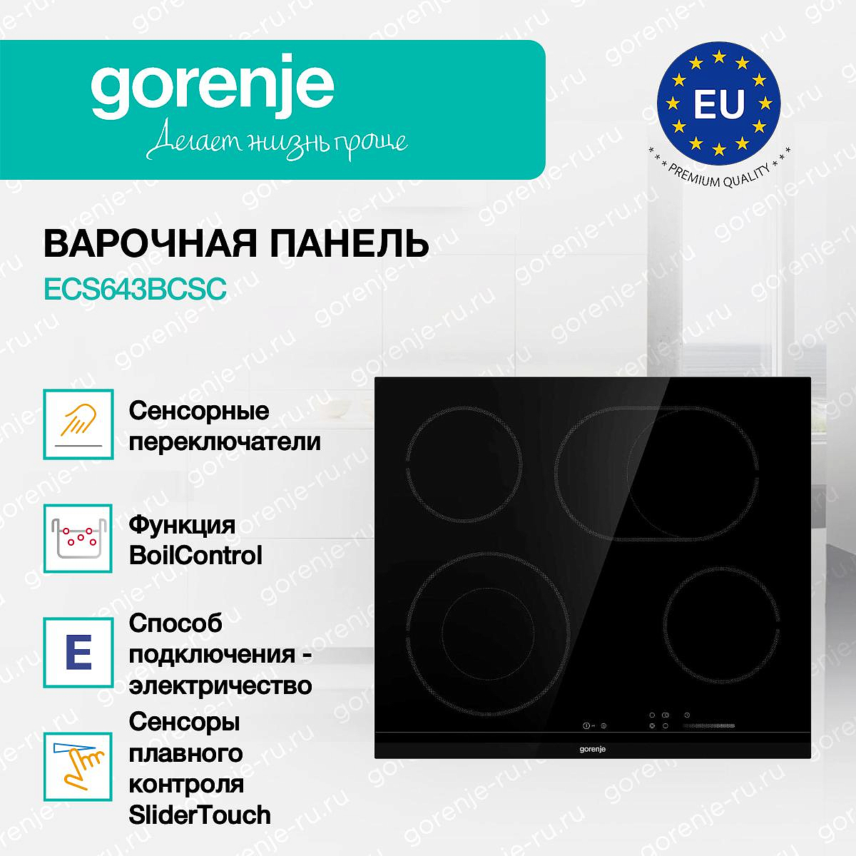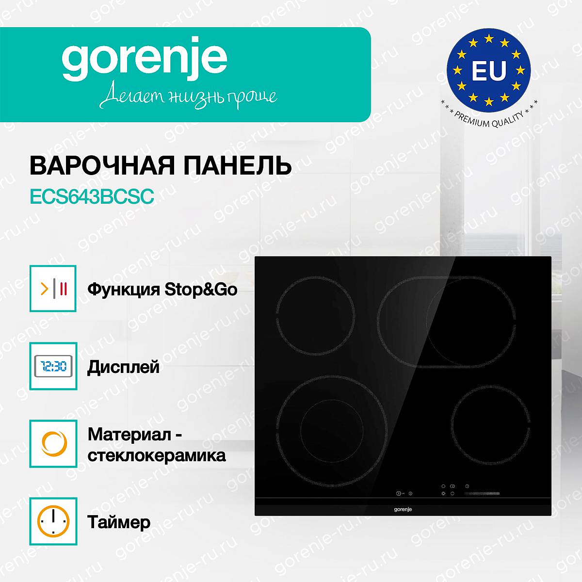 ** Все информационные материалы, представленные на Сайте, носят справочный характер и не могут в полной мере передавать достоверную информацию о свойствах, комплектации и характеристиках товара, включая цвета, размеры и формы. Фирма-производитель оставляет за собой право на внесение изменений в конструкцию, дизайн и комплектацию товара без предварительного уведомления. Перед оформлением Заказа Покупатель должен обратиться к Продавцу для уточнения свойств и характеристик Товара. Подробная информация о товаре указывается в инструкции и на упаковке товара. Используемое название в России: Горенье ECS643BCSC