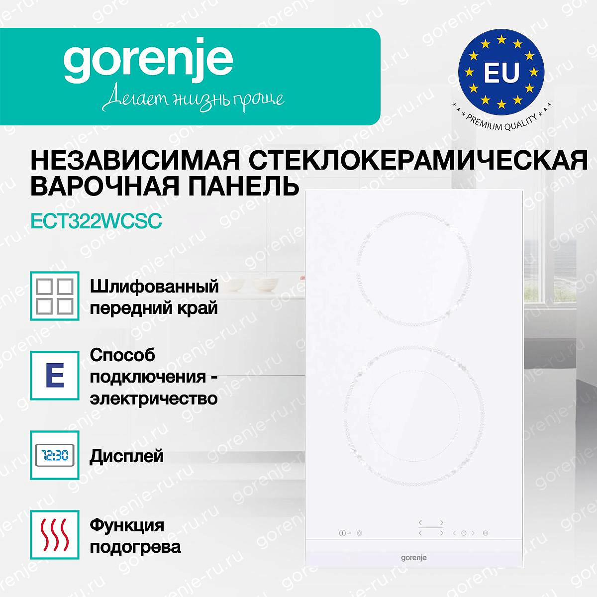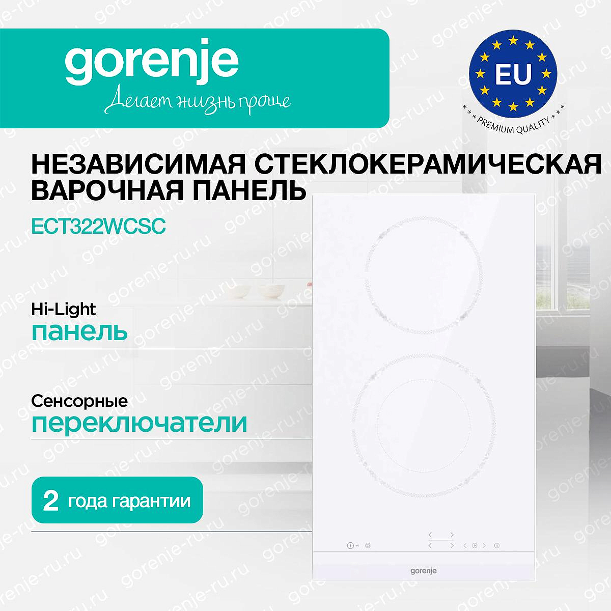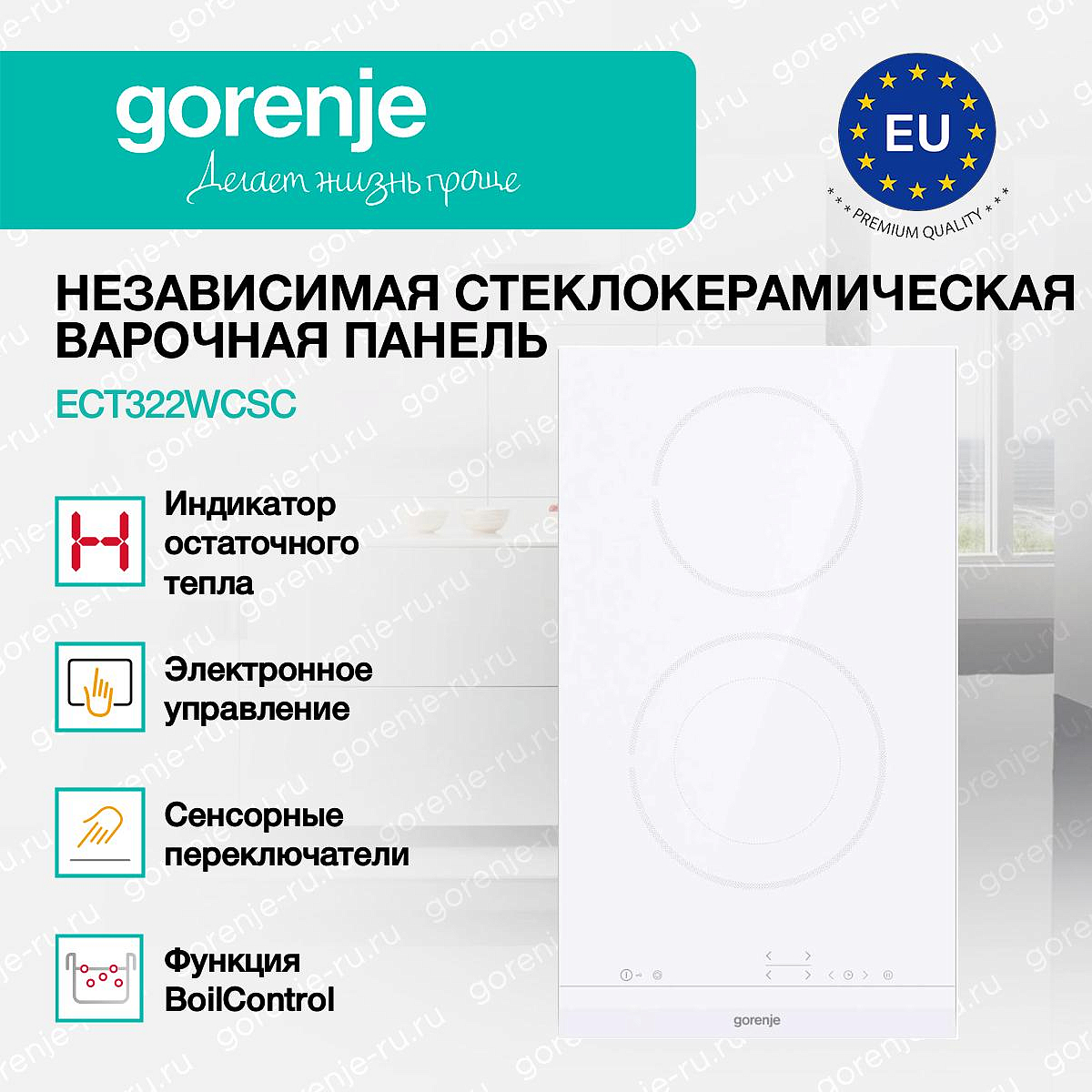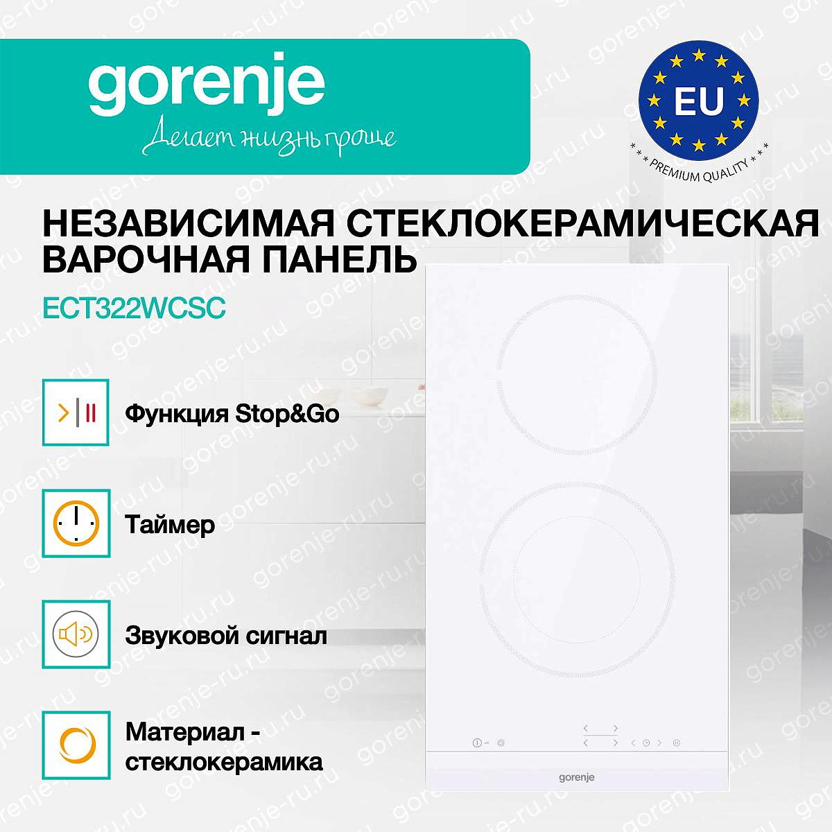 ** Все информационные материалы, представленные на Сайте, носят справочный характер и не могут в полной мере передавать достоверную информацию о свойствах, комплектации и характеристиках товара, включая цвета, размеры и формы. Фирма-производитель оставляет за собой право на внесение изменений в конструкцию, дизайн и комплектацию товара без предварительного уведомления. Перед оформлением Заказа Покупатель должен обратиться к Продавцу для уточнения свойств и характеристик Товара. Подробная информация о товаре указывается в инструкции и на упаковке товара. Используемое название в России: Горенье ECT322WCSC