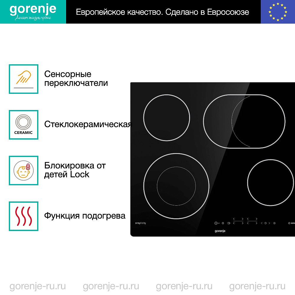 Независимая стеклокерамическая варочная панель Gorenje ECT643SYB — модель из коллекции Gorenje Simplicity, которую отличают минималистичный современный дизайн, большой выбор функций, простое управление и высокая энергоэффективность. Техника этой серии помогает легко и быстро справляться с самыми сложными задачами на вашей кухне. Модель выполнена в черном цвете. Оборудована четырьмя стеклокерамическим конфорками. Одна из них двухконтурная, с изменяемой в зависимости от размера посуды площадью нагрева. Еще одна может трансформироваться в овальную конфорку FishZone, что обеспечивает возможность готовить блюда в специальной посуде — утятнице, гусятнице или другой утвари нестандартной формы.